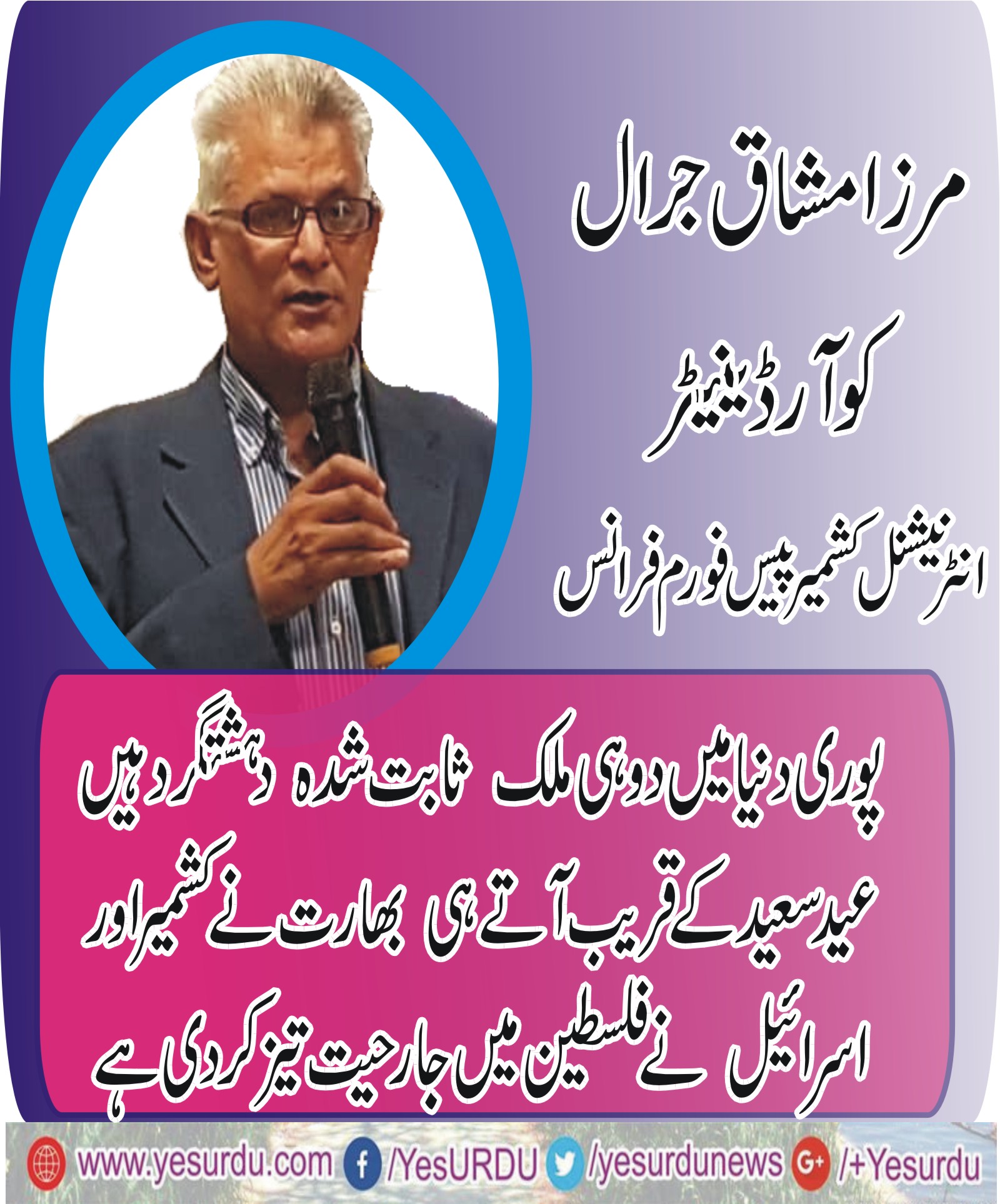 دنیا میں بھارت اوراسرائیل ثابت شدہ دہشتگرد ملک ہیں، عید کے نزدیک آتے ہی دونوں نے کشمیریوں اورفلسطینیوں پر عرصہ حیات تنگ کردیا، مرزا مشتاق جرال