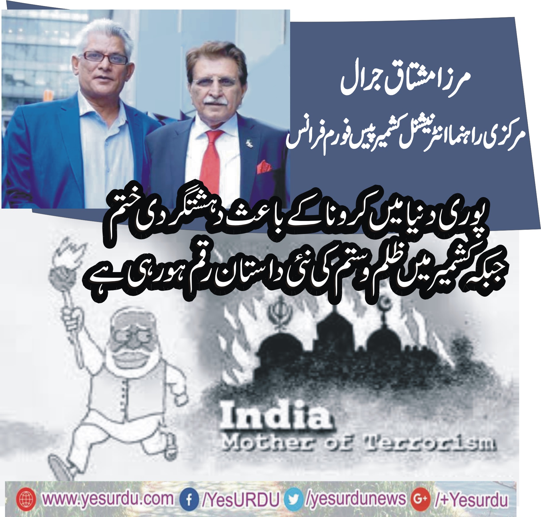 پوری دنیا میں کرونا کے باعث دہشتگردی ختم جبکہ مودی حکومت کی سرپرستی میں مقبوضہ کشمیر میں ظلم وستم کی نئی داستان رقم ہورہی ہے، مرزا مشتاق جرال