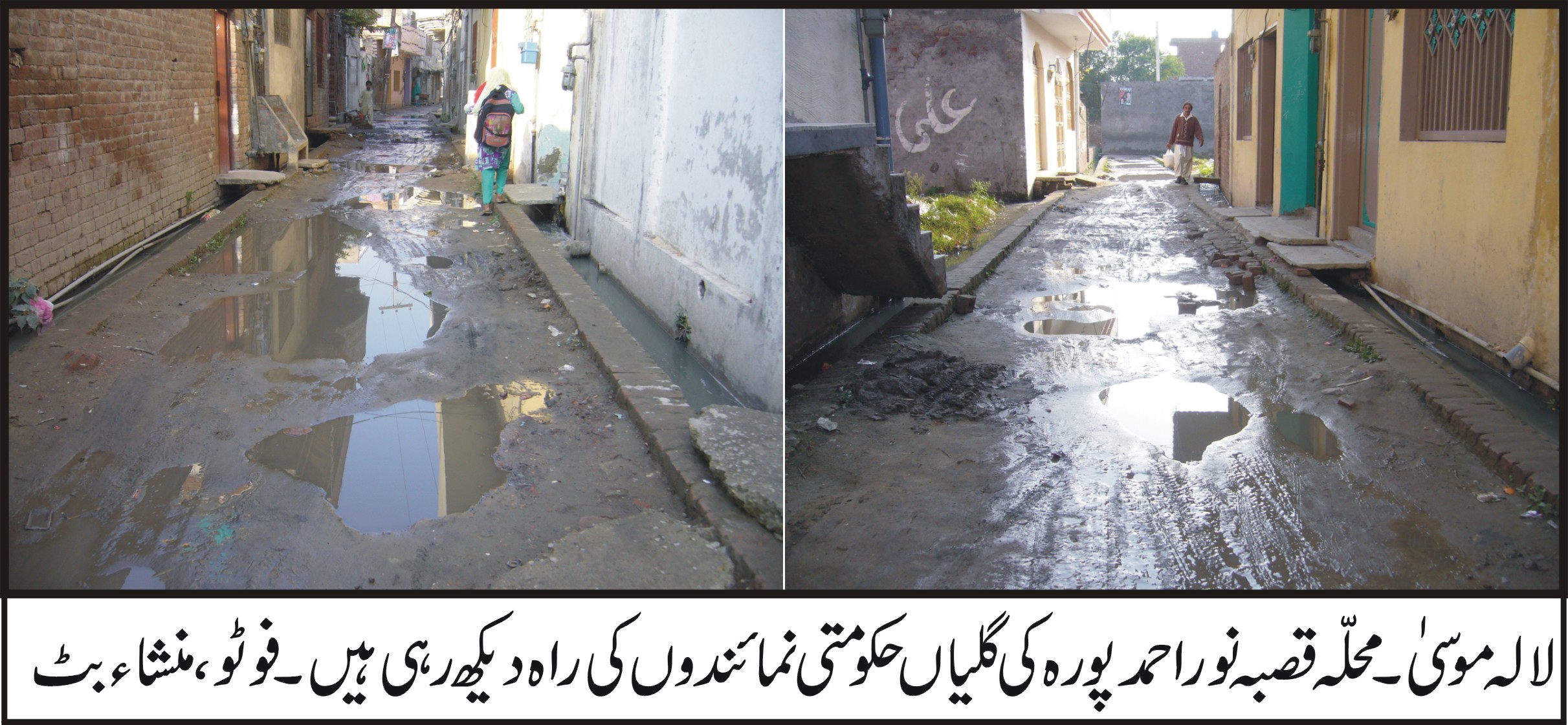 لالہ موسیٰ (محمدمنشاء بٹ )قصبہ محلہ لالہ موسیٰ کی گلی یوسف شاہ والی موتی مسجد والی اور محمد پورہ والی گلی گزشتہ طویل عرصہ سے اپنے مسیحا کا رستہ ڈھونڈ رہی ہیں تفصیلات کے مطابق قصبہ محلہ لالہ موسیٰ کی گلیوں یوسف شاہ والی ، موتی مسجد والی اور محمد پورہ والی گلی گزشتہ طویل عرصہ سے اپنے مسیحا کا رستہ ڈھونڈ رہی ہیں اور حکمرانوں کی عدم توجہ سے یہ گلیاں لوگوں کیلئے مسائلستان بن گئی ہیں عوامی نمائندگان کئی با ر توجہ اس جانب بندول کرانے کے باوجود تاحال یہ گلیاں ٹوٹ پھوٹ کا شکار ہیں اور جسکی وجہ سے لوگوں کے مسائل اور پریشانیاں بڑھ گئی ہیں عوامی سماجی حلقوں نے ارباب اختیار خصوصا وزیر اعلیٰ پنجاب میاں شہباز شریف سے پر زور اپیل کی ہے کہ ان گلیوں کی حالت زار پر رحم کیا جائے تاکہ لوگوں کے مسائل حل ہو سکیں