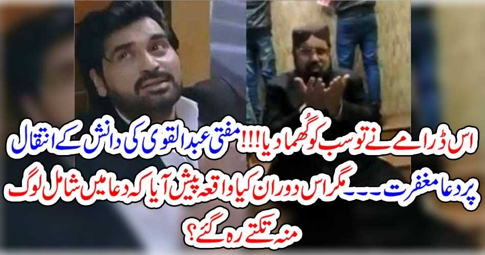 والی ویڈیو میں دیکھا جا سکتا ہے کہ مفتی عبدالقوی موبائل پر وفات کی اطلاع سنتے ہیں اور پھر دعا پڑھانا شروع کرتے ہیں۔ دعا مانگے ہوئے انہوں نے کہا کہ یا اللہ دانش کواس دنیا سے زیاد حوریں آخرت میں بھی عطا فرما اور اللہ سے دعا کی کہ دانش کو جنت میں اعلیٰ مقام عطا فرمائے۔ مفتی عبدالقوی دعا کے دوران آبدیدہ ہو گئے، تاہم اردگرد موجود افراد مفتی عبدالقوی کی دعا کے دوران ہنستے رہے۔مفتی عبدالقوی نےدانش کی فاتحہ پڑھا ڈالی۔ دعا کے دوران مفتی صاحب ڈرامے کے مرکزی کردار دانش کی وفات پرآ بدیدہ بھی ہوگئےسوشل میڈیا پر سامنے آنے والی ویڈیو میں یہ معلوم نہ ہو سکا کہ مفتی عبدالقوی نے یہ دعا مذاق کے طور پر کی یا وہ اس معاملے سے لاعلم تھے کہ دانش صرف ایک ڈرامے کا کردار ہے۔واضح رہے گزشتہ روز ’’ میرے پاس تم ہو‘‘ کی آخری قسط میں ایک کردار دانش انتقال کر گیا تھا۔ مقبولیت کے تمام ریکارڈ توڑنے والا ڈرامہ میرے پاس تم ہو کی آخری قسط نشر ہونے کے بعد سوشل میڈیا پر زیر بحث رہا ۔ لوگوں نے اس ڈرامے میں مرکزی کردار دانش کی موت پر میمز بھی بنائے۔ میرے پاس تم ہو‘ کے اختتام پر شائقین کے دلچسپ تبصرے سوشل میڈیا کی زینت، سوشل میڈیا پر مداحوں نے تنز و مزاح کرتے ہوئے کہا کہ ’دانش جانتا ہے کہ سکون صرف قبر میں ہے‘