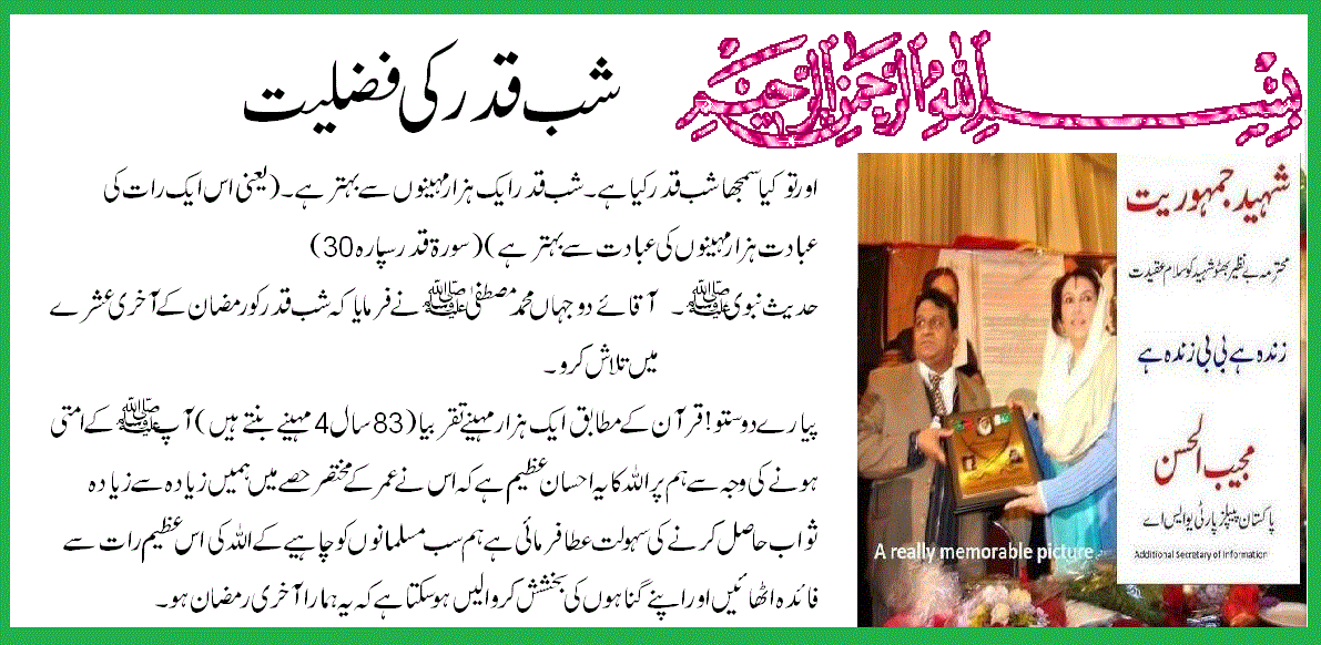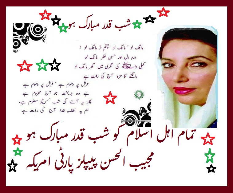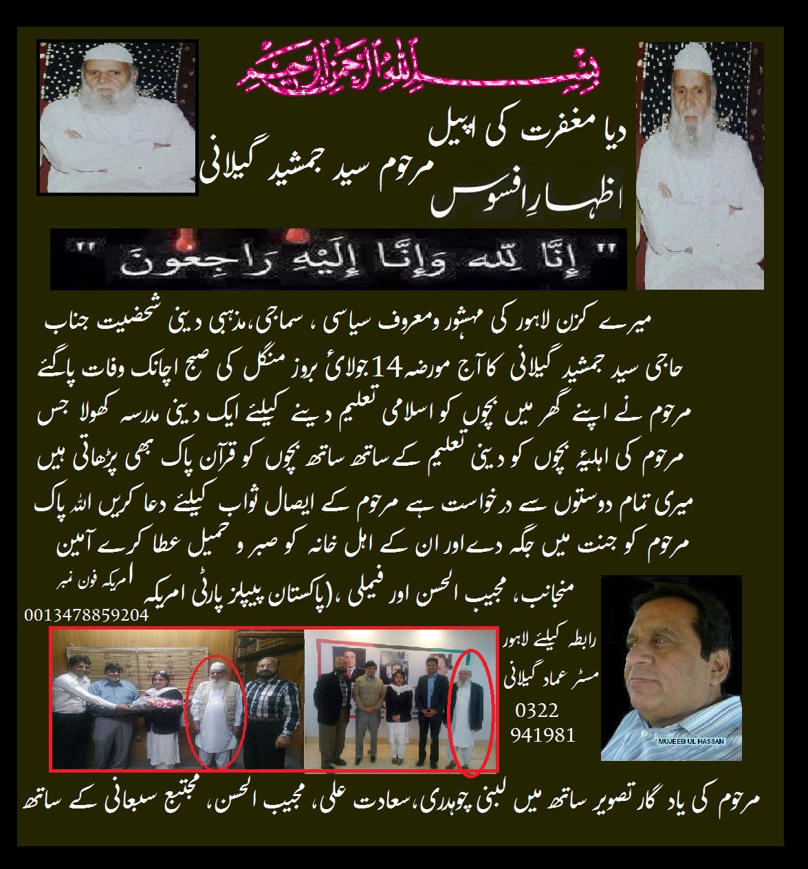 نیویارک (مجیب الحسن) تمام دوستوں کو شب قدر کی رات مبارک ہو آپ تمام دوستوں سے درحواست ہے آج میرے عزیز کذن پھوپھی ذات بھای فوت ہو گۓ آپ سے انکی مغفرت کی دعا کی اپیل ہے مرحوم کا نام سید جمشید گیلانی تھا ان کا انتقال لاہور میں ہوا۔