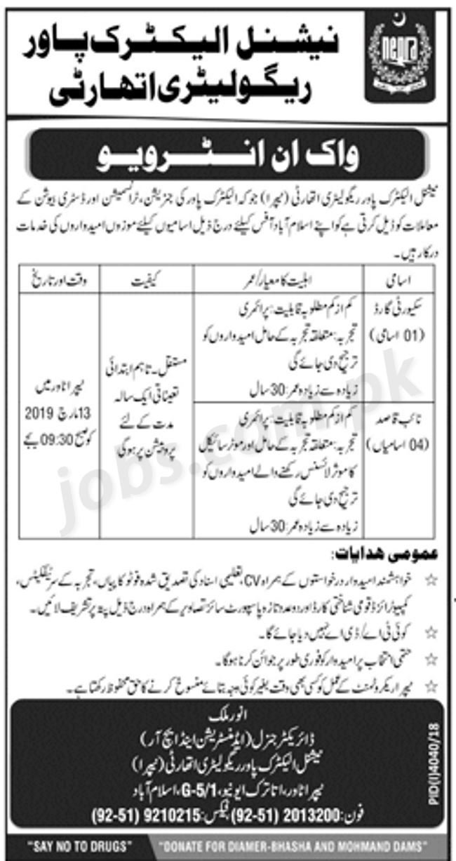 NEPRA Jobs 2019 for 5+ Naib Qasid and Security Guard Posts (Walk-in Interviews)3 March, 2019 Post Views - پوسٹ کو دیکھا گیا: 390