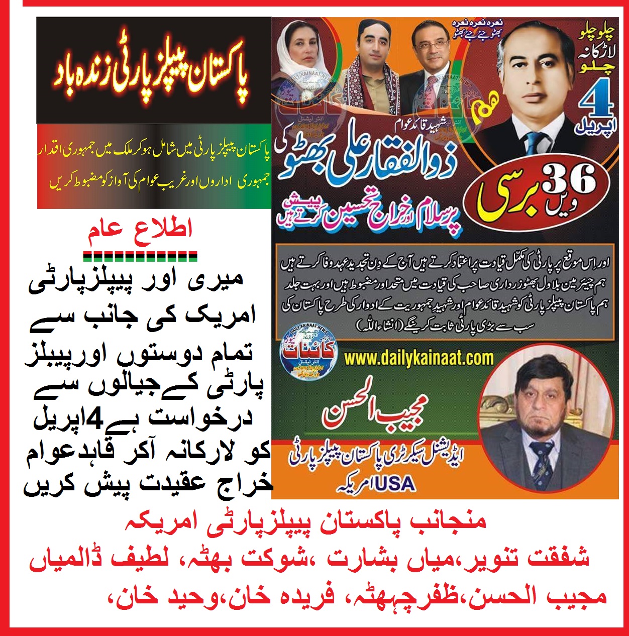 نیویارک (مجیب الحسن سے) پاکستان پیپلزپارٹی امریکہ کے صدر شفقت تنویر اور سیکرٹری جنرل شوکت بٹھہ نے اپنے بیان میں کہا کہ پارٹی کے بانی ذوالفقار علی بھٹو کی برسی حسب روایت نہایت عقیدت و احترام سے کباب کنگ ریسٹورنٹ، جیکسن بائٹس پر شام ساڑھے چھ بجے منائی جائے گی۔ انہوں نے سب ساتھیوں اور عہدیداران سے برسی کی تقریب میں شرکت کیلئے کہا ہے، اس موقع پر ذوالفقار علی بھٹو کی ملک و قوم کیلئے خدمات کے مختلف پہلوؤں پر روشنی ڈالی۔
