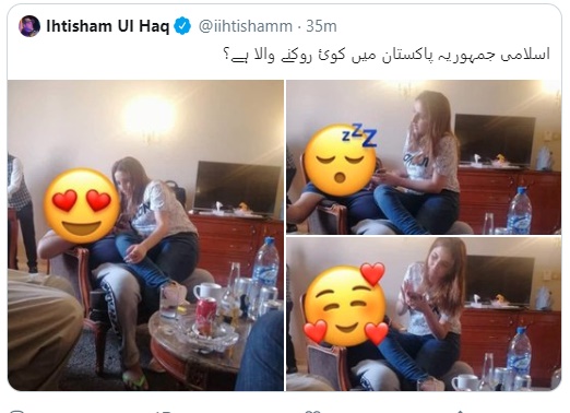 علاوہ موجود شخصیت کے چہرے کو نا صرف ایموجی سے فلٹر کیا بلکہ اپنے فالورز کے لیے ایک پیغام بھی لکھ دیا ۔اس ٹویٹ پر پاکستانی ٹویٹر صارفین کی طرف سے سخت ردعمل سامنے آیا۔ اکثریت نے حریم شاہ کے اس فعل کی مذمت کرتے ہوئے احتشام الحق کو بھی آڑے ہاتھوں لیا کہ انہیں ایک بُرائی کو پھیلانے کا ذریعہ نہیں‌بننا چاہیے تھا۔ بعض صارفین اپنی رائے بھی دیتے رہے کہ شاید تصویر میں موجود اجنبی مرد وفاقی وزیر شیخ رشید ہیں، جبکہ بعض کے نزدیک کوئی دوسری بڑی سیاسی شخصیت بھی ہونے کا امکان ہے۔ احتشام الحق سے فلٹر ختم کر کے اصل تصاویر شیئر کرنے کا بھی مطالبہ کیا گیا۔ اس ساری صورتحال کو دیکھتے ہوئے، احتشام الحق نے بالآخر ٹویٹ کو ہی ڈیلیٹ کر دیا۔ لیکن سوال وہیں موجود ہے، آیا تصویر میں‌حریم شاہ کے ساتھ کون مرد موجود تھا جس کے چہرے کو فلٹر کر کے چھپایا گیا؟ گزشتہ کچھ روز سے وفاقی وزیر ریلوے شیخ رشید سمیت دیگر شخصیات کی آڈیو کالز اور ویڈیوز لیک کرنے کی دھمکیاں دینے والی حریم شاہ کے پول کھلنے لگے ، ایسی تصاویر سامنے آگئیں کہ عام اور شریف آدمی شرم سے پانی پانی ہو جائے ۔ تازہ ترین لیک ہونے والی تصاویر میں انہیں ایک نامعلوم شخص کی گود میں بیٹھے دیکھا جاسکتا ہے۔سوشل میڈیا پر حریم شاہ کی 3 تصاویر سامنے آئی ہیں جن میں انہیں ایک شخص کی گود میں بیٹھے ہوئے دیکھا جاسکتا ہے ۔ جس کمرے میں یہ تصاویر بنائی گئی ہیں اس میں 3 مزید افراد کی موجودگی بھی ظاہر ہورہی ہے۔