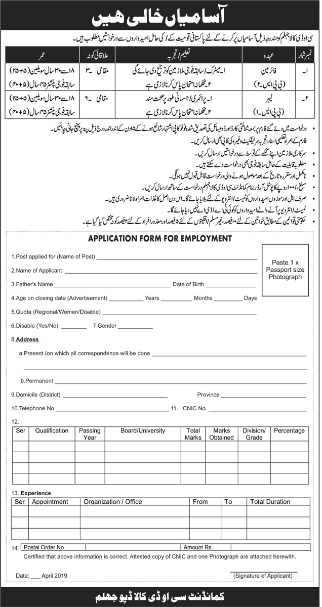 Pak Army Jobs 2019 for 9+ Primary/Matric / USM and Fireman Posts at Central Depot Jhelum to be filled immediately. Required qualification from a recognized institution and relevant work experience requirement are as following. Eligible candidates are encouraged to apply to the post in prescribed manner. Incomplete and late submissions/applications will not be entertained. Only short listed candidates will be invited for interview and the selection process. No TA/DA will be admissible for Test/Interview. Last date to apply to the post and submit application along with required documents is 15th April 2019.