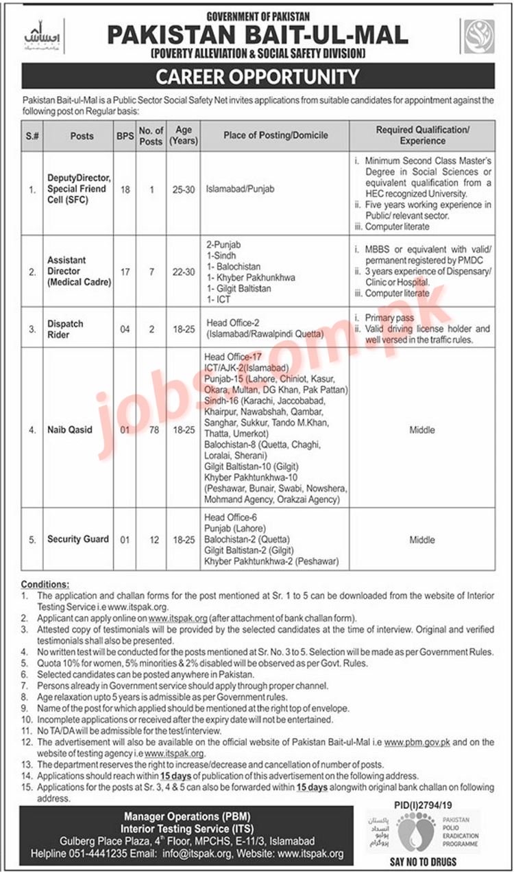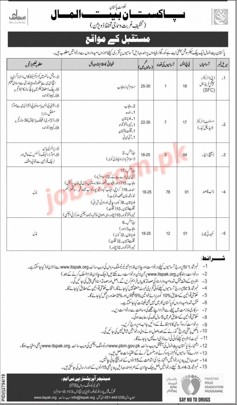 Pakistan Baitul Maal Jobs 2019 for 100+ Assistant Directors, Dy Directors, Dispatch Riders, Naib Qasid & Other
