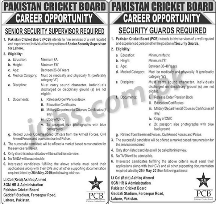 Pakistan Cricket Board (PCB) Jobs 2019 for Security Guards & Supervisors to be filled immediately. Required qualification from a recognized institution and relevant work experience requirement are as following. Eligible candidates are encouraged to apply to the post in prescribed manner. Incomplete and late submissions/applications will not be entertained. Only short listed candidates will be invited for interview and the selection process. No TA/DA will be admissible for Test/Interview. Last date to apply to the post and submit application along with required documents is 25th May 2019.