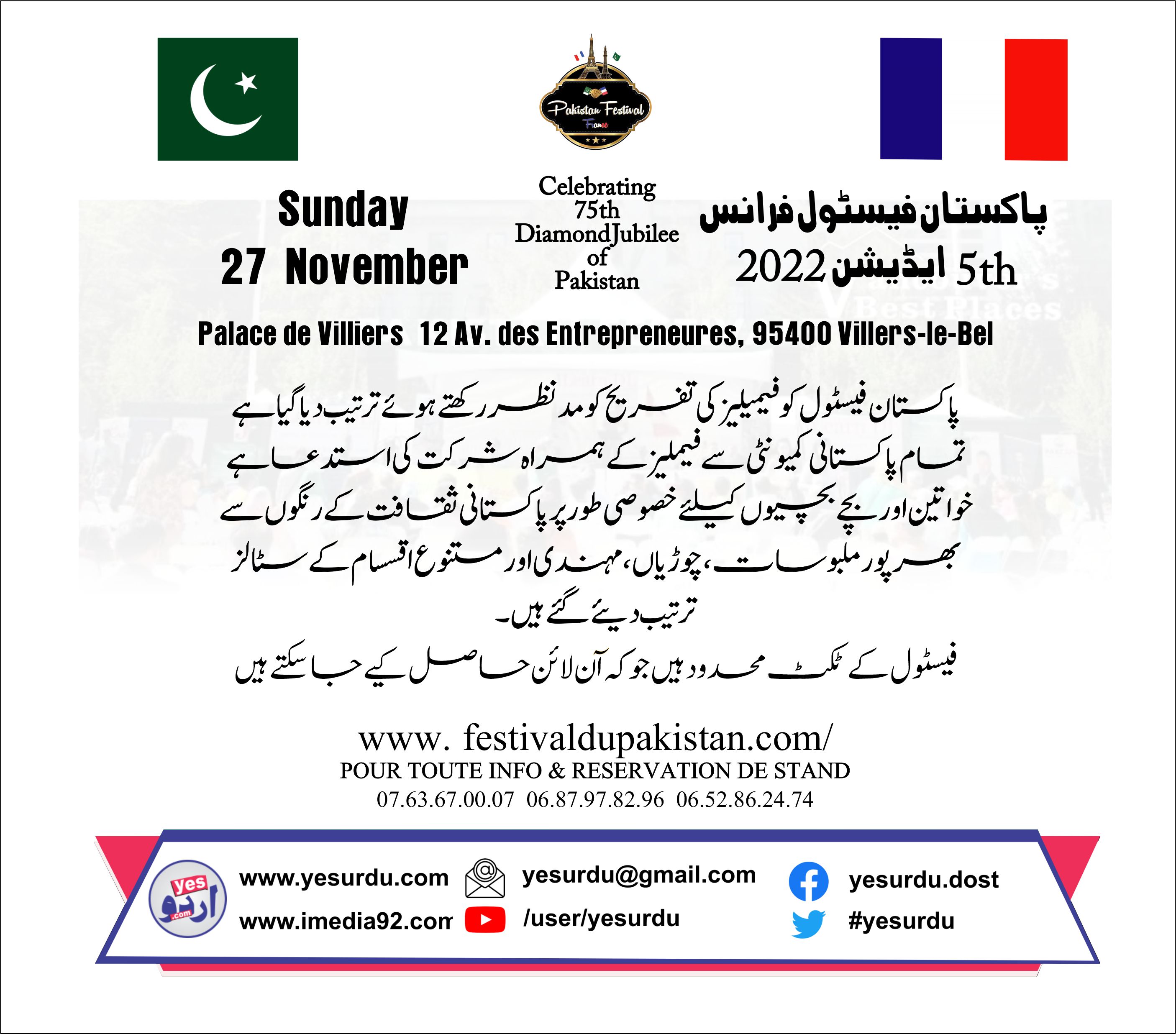 پیرس(یس اردو نیوز رپورٹ) پاکستان فیسٹول فرانس کا پانچواں ایڈیشن وطن عزیز کی ڈائمنڈ جوبلی کے طور پر منعقد کیا جارہا ہے۔ فیسٹول 2022 فیمیلیز بچے بچیوں کیلئے منفرد تفریح فراہم کریگا۔ پاکستان فیسٹول فرانس کمیٹی نے واضح کیا کہ پاکستان فیسٹول فرانس میں پاکستانی ثقافت کے نمایاں پہلو اجاگر کرنے اور کمیونٹی کو ایک تعمیری تفریح مہیا کرنے کیلئے ترتیب دیا گیا ہے۔ یہ فیسٹول فرانس میں فیسٹول کمیٹی بہت منظم انداز میں ہر سال منعقد کرتی آرہی ہے اور اس حوالے سے پیرس کی سٹی گورنمنٹ اور فیسٹول کمیونٹی تمام انتظامات دیکھتی ہے ۔