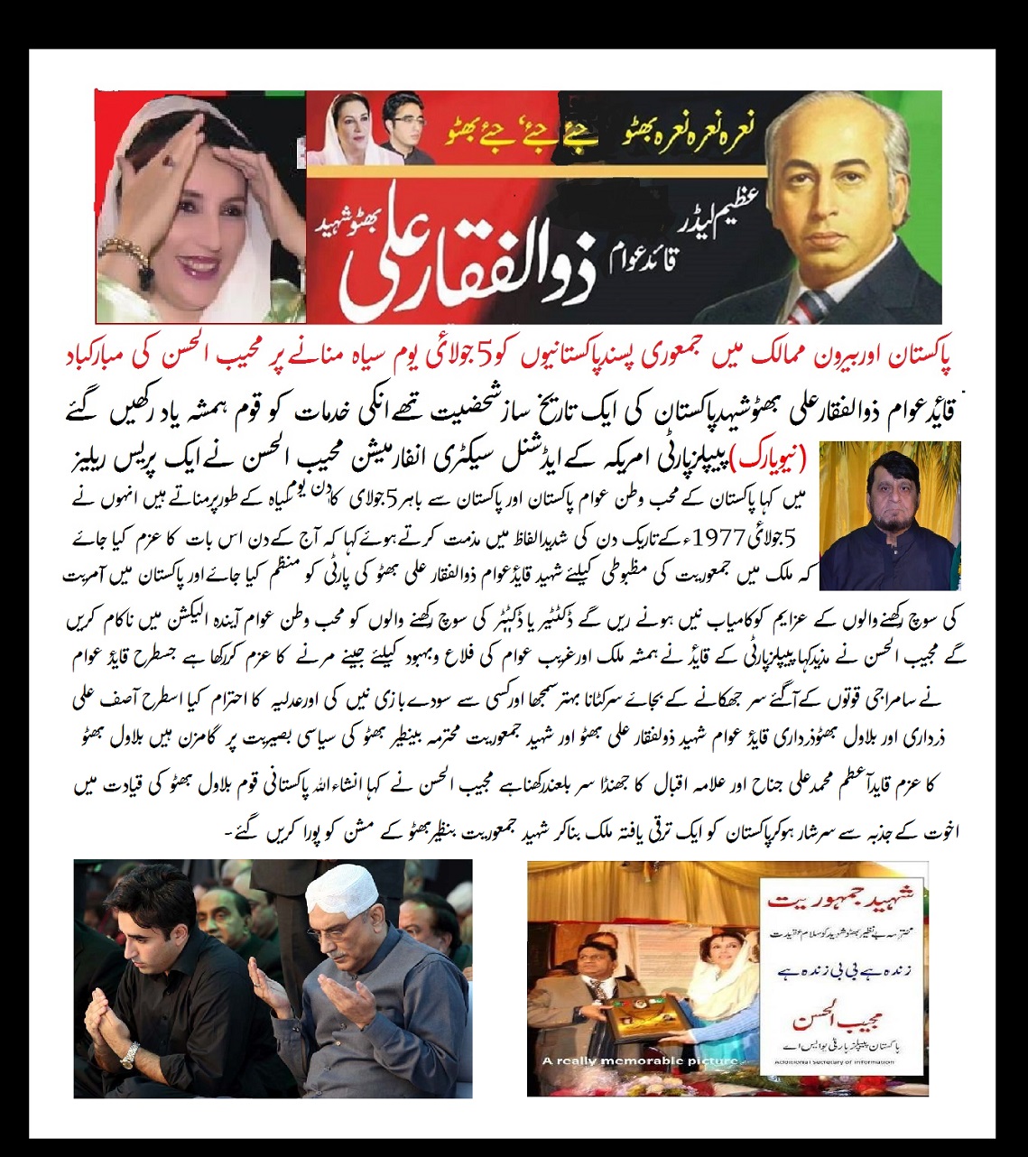 نیویارک (مجیب الحسن) پیپلز پارٹی امریکہ کے ایڈیشنل سیکرٹری انفارمیشن مجیب الحسن نے کہا کہ پاکستان کے محب وطن عوام پاکستان اور پاکستان کے باہر 5 جولائی کا دن یوم سیاہ مناتے ہیں انہوں نے 5 جولائی 1977 کے تاریک دن کے شدید الفاظ میں مذمت کرتے ہوئے کہا کہ آج کے دن اس بات کا عزم کیا جائے گا کہ ملک میں جمہوریت کی مضبوطی کیلئے شہید قائد عوام ذوالفقار علی بھٹو کی پارٹی کو منظم کیا جائے اور پاکستان میں آمریت کی سوچ رکھنے والوں کے عزائم کا کامیاب نہیں ہونے دیں گے۔