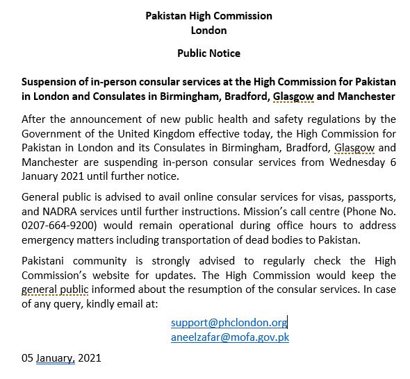 اسلام آباد(ایس ایم حسنین) لندن میں پاکستانی ہائی کمیشن اور برمنگھم، بریڈ فورڈ، گلاسگو اور مانسچٹر میں واقع قونصلیٹ میں بالمشافہ قونصلر سروسز معطل کردی گئی ہیں۔ لندن میں پاکستانی ہائی کمیشن کی طرف سے جاری تفصیلات کے مطابق مقامی حکومت کی طرف سے نئے پبلک ہیلتھ وسیفٹی ریگولیشنز کے اجرا کے بعد پاکستان ہائی کمیشن اور اس کے متعلقہ قونصلیٹ میں آج بدھ 6 جنوری 2021 سے بالمشافہ قونصلر سروسز معطل کردی گئی ہیں۔ ان کا اطلاق تاحکم ثانی ہوتا رہیگا۔ اس ضمن میں ہائی کمیشن نے ہدایت جاری کی ہیں کہ عوام الناس ویزہ، پاسپورٹ اور نادرا کی سروسز آن لائن طریقہ کار کے مطابق حاصل کرسکتے ہیں۔ اس دوران ہائی کمیشن کا رابطہ نمبر دفتری اوقات کار کے مطابق کھلا رہیگا۔ جس دوران برطانیہ میں پاکستانی کسی بھی ایمرجنسی بشمول میتوں وغیرہ کی ٹرانسپورٹیشن کیلئے رابطہ کرسکتے ہیں۔ہائی کمیشن نے کمیونٹی کو مزید معلومات کیلئے ویب سائٹ کے ذریعے معلومات تک رسائی کو یقینی بنایا ہے۔ جس سے مستقبل میں قونصلر خدمات کی بحالی کے بارے میں معلومات حاصل کی جاسکیں گی۔