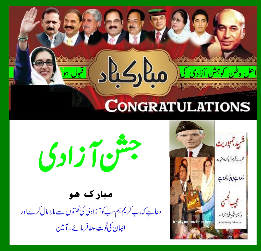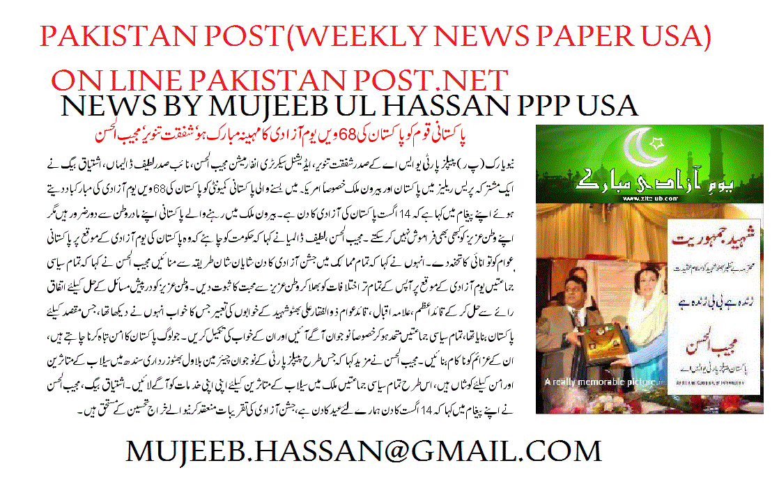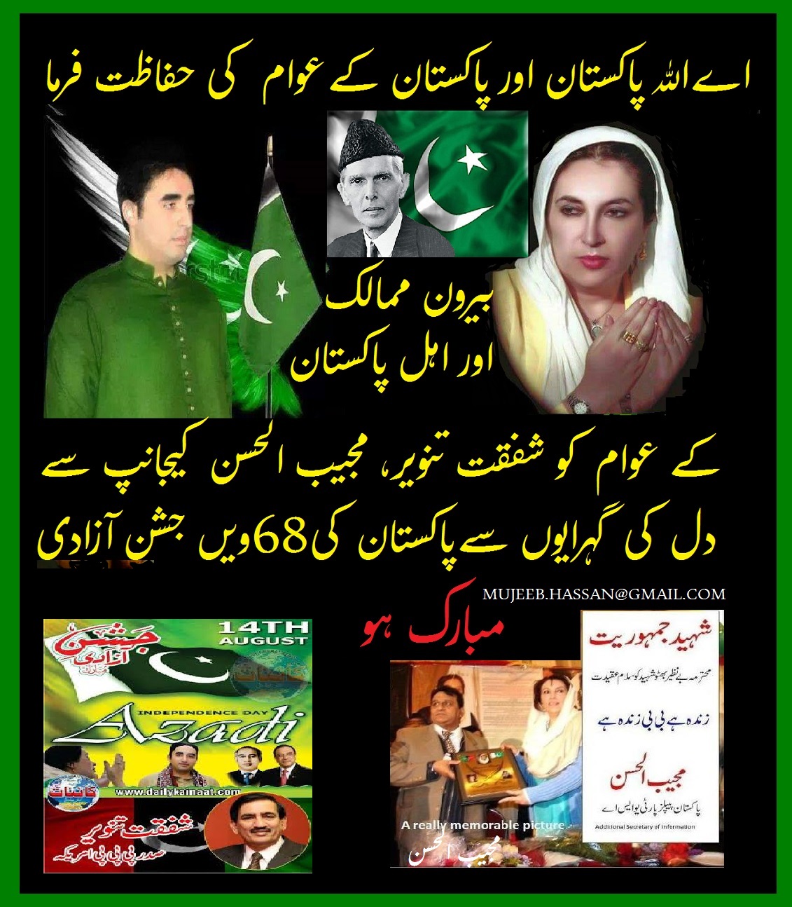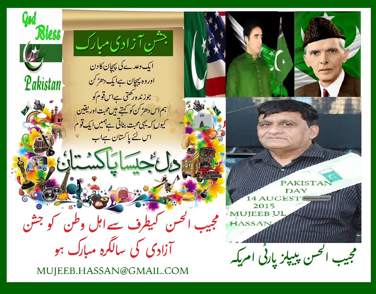 امریکہ (مجیب الحسن) بیرو ن ممالک اور اہل پاکستان کے عوام کو شفقت تنویر، مجیب الحسن کیجانب سے دل کی گہرائیوں سے پاکستان کی 68 ویں جشن آزادی مبارک ہو۔