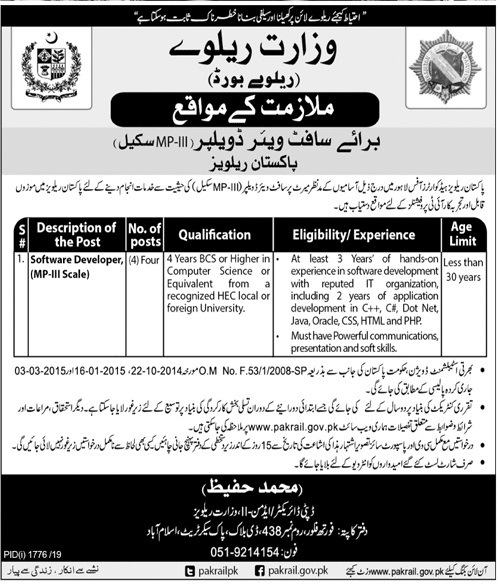 PAKISTAN, RAILWAY, RAILWAY, BOARD, REQUIRED, SOFTWARE, DEVELOPER, MP-III, SCALE
