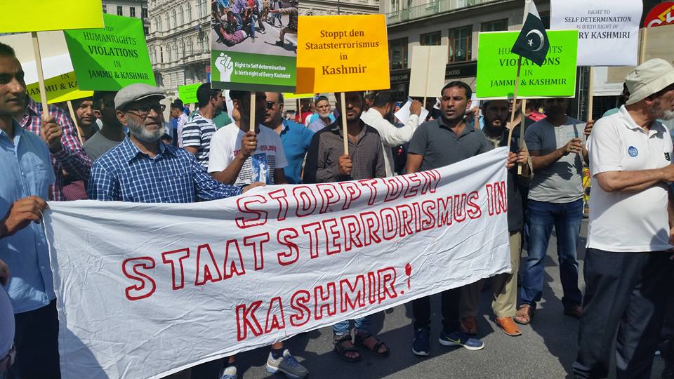 ویانا (اکرم باجوہ) پاکستانی کمیونٹی ویانا کی جانب سے کشمیر یوں کے ساتھ اظہار یکجہتی کے سلسلہ میں آسٹرین پارلیمنٹ کے سامنے پرآمن ریلی نکالی گئی اورکا رپلاٹس انڈین ایمبیسی کے سامنے پرآمن احتجاجی مظاہرە کیا گیا جس میں سینکڑوں لوگوں نے شرکت کی اور انڈیا کی جانب سے کشمیر یوں پر بے جا ظلم کے خلاف آواز بلند کی گی۔