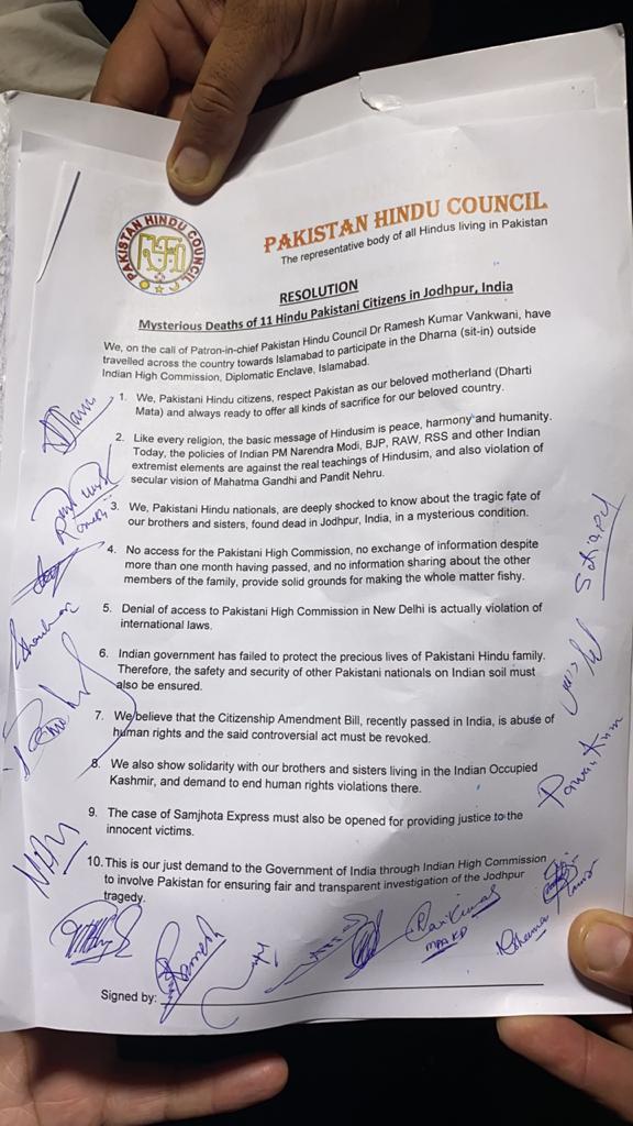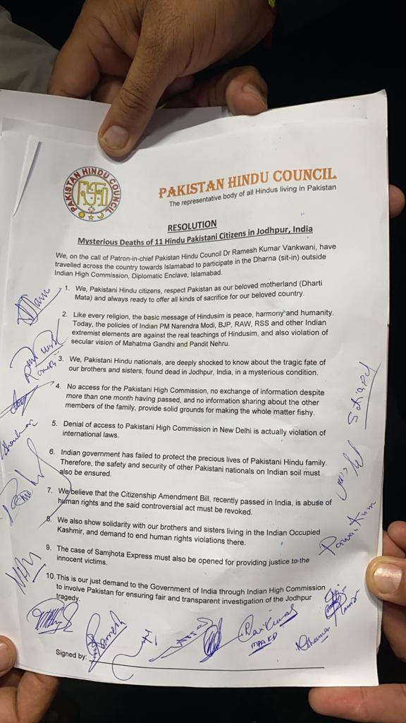 انھوں نے کہا کہ پیر کو ہم آپ کا مطالبہ بھارتی ایمبیسی کے آگے پیش کریں گے.یہ ہجوم بھارتی ایمبیسی کے دروازے کو دیکھنا چاہتا ہے.قرارداد کو ابھی پڑھو گا اور میڈیا کے ساتھ ڈپلو میٹک انکلیو میں جاو گا.ہم براہ راست بھارتی ایمبیسی کے افسران کو اپنے مطالبات دینا چاہتے ہیں.انتظامیہ سے درخواست ہے کہ رکاوٹ نہ ڈالیں.رمیش کمار کی جانب سے پیش کردہ قرارداد میں کہا گیا کہ بھارتی ہائی کمیشن کے سامنے دھرنا دیں گے.ہم پاکستان کو اپنی دھرتی سمجھتے ہیں.ہندو برادری اپنے ملک کے لیے ماضی کی طرح قربانی دینے کو تیار ہے. ہر مذہب کی طرح ہندو مذہب امن کا درس دیتا ہے، موجودہ بھارتی حکومت اس کے خلاف ہے. ہندو مذہب امن سکھاتا ہے کسی کی آواز دبانا نہیں سکھاتا.مہاتما گاندھی کے سیکولر بھارت پر سوالیہ نشان آگیا ہے. 11 لوگوں کو اس طرح قتل کرنے پر ہندو برادری صدمے میں ہے.