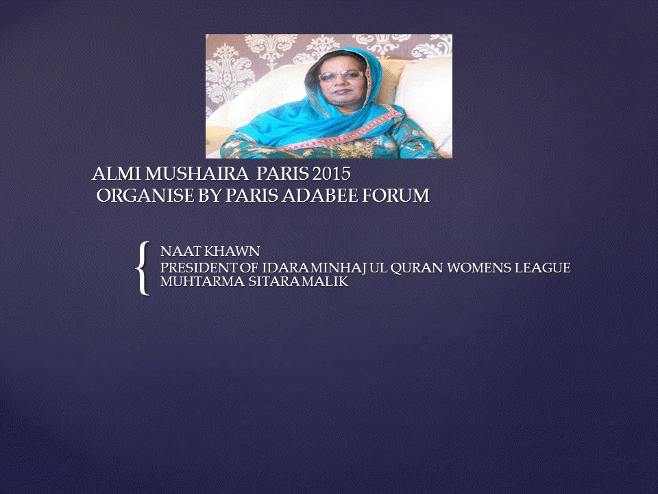 پیرس (سمن شاہ) پیرس ادبی فورم کے زیر اہتمام ہونے والے عالمی مشاعرہ میں محترمہ ستارہ ملک کی خصوصی شرکت۔ پیرس ادبی فورم کے عالمی مشاعرہ میں ادرہ منہاج القران کی وومن لیگ کی صدر محترمہ ستارہ ملک اپنی خوبصورت آواز میں نعت کا نذرانہ پیش کریں گی۔
