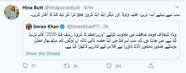 وزیر اعظم عمران خان کے اس پیغام پر ن لیگ کی سرگرم خاتون رکن اسمبلی حنا پرویز بٹ بھی میدان میں آگئیں اور وزیر اعظم عمران خان کو مخاطب کرتے ہوئے کہا کہ ’’سب سے پہلے آپ، ترین، علیم، واوڈا اور دیگر ایک ایک کروڑ جمع کرا کر نیک فنڈ کا آغاز کریں۔۔‘‘