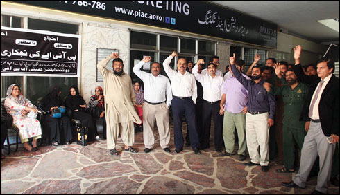 قومی ایئرلائن پی آئی اے کی مجوزہ نجکاری کیخلاف ملازمین کا احتجاج تیسرے روز میں داخل ہوگیا ہے،مرتا کیا نہ کرتا کے مصداق، ملازمین اپنے سروں پر لٹکتی نجکاری کی تلوار سے بچنے کیلئے، احتجاج کے روایتی طریقے کے ساتھ ہی کچھ ایسےٹرینڈ بھی سیٹ کررہے ہیں جو متوجہ کرنےکے علاوہ دلچسپ بھی ہیں،کل پی آئی اے ہیڈ آفس پر احتجاجی دھمال ڈالا۔آج پی آئی اے ملازمین نے نجکاری کی بلا کو ٹالنے کے لئے صدقہ دینے کا اعلان کیا اور اس کے لئے چندا کر کے دو گائیں قربان کیں۔ہنگامی پریس کانفرنس میں جوائنٹ ایکشن کمیٹی کے چیئرمین کیپٹن سہیل بلوچ نے سیکریٹری ایوی ایشن کی ملاقات کی دعوت مسترد کرتے ہوئے کہا کہ مذاکرات صرف وزیراعظم سے ہوں گے۔احتجاج کے تیسرے دن بھی ہیڈ آفس سمیت پی آئی اے کے تمام دفاتر بند رکھے گئے۔ ملازمین نے حکومت کے خلاف اور نجکاری نا مظور کے نعرے لگائے۔