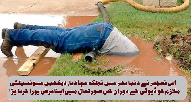 واشنگٹن ( مانیٹرنگ ڈیسک ) اس تصویر کو دیکھ کر آپ یقیناُُ یہی سمجھ رہے ہونگے کہ یہ کوئی لاش ہے جو اوندھے منہ پانی میں گری پڑی ہے مگر حقیقت جان کر آپ بھی حیران ہو جائیں گے کہ یہ ایک جیتا جاگتا انسان ہے جو اپنی پیشہ وارانہ ذمہ داریاں پوری کرنے کیلئے پانی میں اوندھے منہ کام کر رہا ہے ۔اس تصویر میں نظر آنے والا شخص ایک میونسپل ورکر ہے جو ایک خاتون کی شکایت پر اس کے گھر کے قریب پانی کا پائپ فٹ کر رہا ہے ۔
