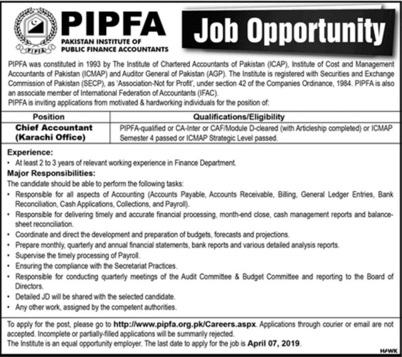 PIPFA Pakistan Jobs 2019 for Chief Accountant and AD Marketing1 April, 2019 Post Views - پوسٹ کو دیکھا گیا: 34