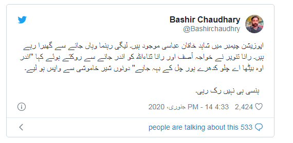 کے رپورٹر کی ٹویٹ کے مطابق سابق وزیر اعظم ہال کی بجائے اپوزیشن لیڈر کے چیمبر میں چلے گئے اسی دوران وہاں مسلم لیگی رہنما رانا تنویر، رانا ثنااللہ اور خواجہ آصف بھی آگئے۔ بشیر چوہدری نے سماجی رابطوں کی ویب سائٹ ٹوئٹر پر اپنے ٹویٹ میں کہا کہ ’’اپوزیشن چیمبر میں شاہد خاقان عباسی موجود ہیں۔ لیگی رہنما وہاں جانے سے گھبرا رہے ہیں۔ رانا تنویر نے خواجہ آصف اور رانا ثناءاللہ کو اندر جانے سے روکتے ہوئے کہا “اندر اوہ بیٹھا اے چلو کدھرے ہور چل کے بہہ جایے” دونوں شیر خاموشی سے واپس ہو لیے۔ ہنسی ہی نہیں رک رہی ‘‘۔