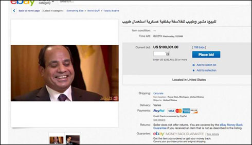 قاہرہ ……… مصر کے صدر اور سابق فوجی سربراہ عبدالفتح السیسی کو آن لائن شاپنگ ویب سائٹ ای بے پر فروخت کے لیے پیش کر دیا گیا ، صدر عبدالفتح السیسی نے محمد مرسی کا تختہ الٹ کر اقتدار حاصل کیا تھا۔
