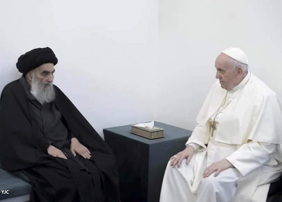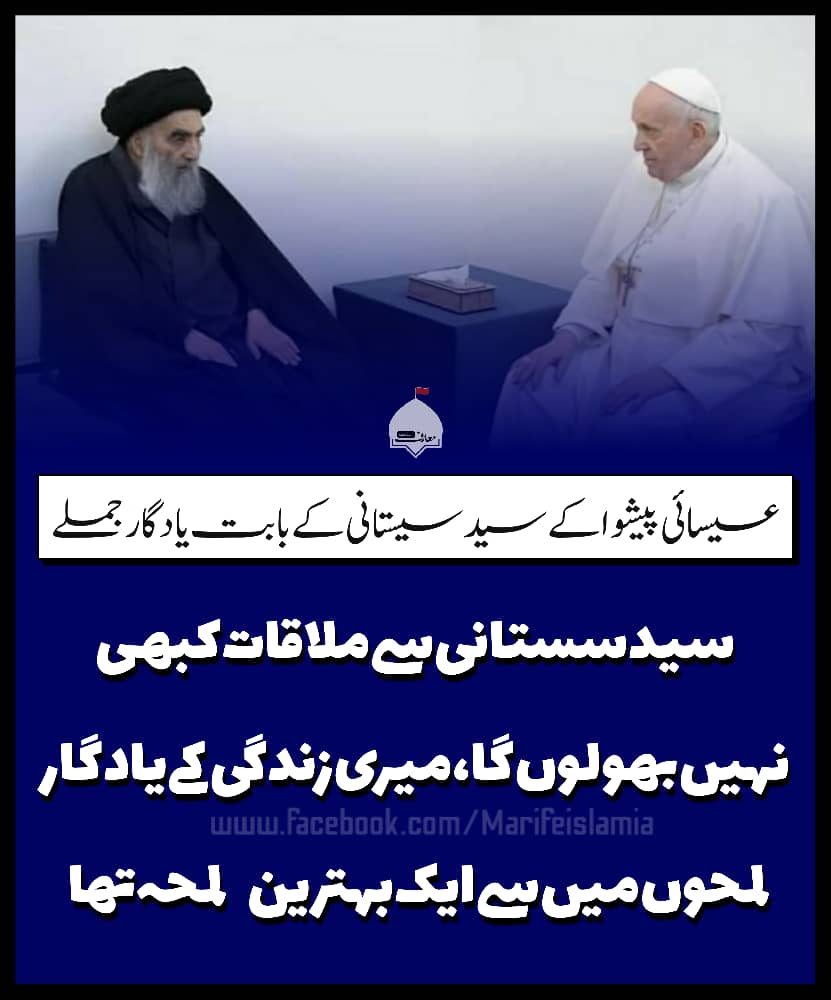 گذشتہ دنوں جب عیسائیت کے سب سے بڑے روحانی پیشوا پوپ فرانسس عراق پہنچے تو اس بات کی امید نہیں تھی کہ ایسا اعلان بھی سننے کو ملے گا کہاجارہاہے کہ عیسائیوں کے روحانی پیشوا نے سکیورٹی خدشات کے پیش نظر عراق کے گنجان آباد علاقے میں آیت اللہ سیستانی نے پیغام دیا کہ میرے گھر میں ملاقات کرلیں جس کے نتیجے میں پہلی بار ایسا ہوا کہ ا عیسائیوں کے روحانی پیشوا کو ان دلیل کا احترام کرتے ہوئے ملاقات کے لیے انکے گھر بکتر بند گاڑیوں کے قافلے میں آنے پر مجبور ہونا پڑا ۔ عیسائیت کی تاریخ میں پہلی بار ایسا ہوا جب کسی روحانی پیشوا پوپ کو کسی کے گھر پر جا کر ملنے کا اتفاق ہوا عیسائی مذہب میں یہ پہلا واقعہ ہے کہ دنیاٸے شیعت کے عظیم مرجع کا ایک چھوٹا سا کراٸے کا گھر دنیا کے بادشاہوں کے محلات پر بھاری ہوگیا بڑے بڑے محلات کے مالک پوپ سے ملنے رومن کیتھلک چرچ ویٹیکن سٹی کا رخ کرتے ہیں اور اس بار خود پوپ فرانسس عراق پہنچے کے بعد آیت اللہ سیستانی سے ملاقات کرنے کے لیے ان کے گھر پہنچے تو دنیا اس عظیم شخصیت کی مزید گرویدہ ہو جب ان کا رہہن سہن بھی سادہ پایا ۔اس حقیقت سے انکار ممکن نہیں کہ عیسائیوں کے روحانی پیشوا نے پہلے کبھی ایسی شخصیت اور گھر کو نہیں دیکھا تھا جو ایک گنجان آباد علاقے کی چھوٹی سی گلی میں ہو۔اور جس میں موجودہ دنیائے اسلام کے سب عظیم شیعت مکتب کا سب سے عظیم انسان رہتا ہو۔خیال رہے کہ مرجع عالی قدر آیت اللہ العظمی سیستانی، عراق کی مضبوط فصیل اور اسلامی دنیا کا عظیم سرمایہ ہیں۔ تاریخی ملاقات کے حوالے سے آیت الله العظمیٰ سیستانی کے دفتر سے جاری ہونیوالے بیان میں کہا گیا ہے کہ آیت اللہ سیستانی نے دنیا کے مختلف ممالک میں لوگوں پر ہونیوالے ظلم و جبر، غربت و افلاس اور دینی و نظریاتی شدت پسندی، بنیادی آزادیوں سے محرومی اور اجتماعی عدالت کے فقدان پر روشنی ڈالی۔ اسی طرح انہوں نے مشرق وسطیٰ میں جنگ، پرتشدد کارروائیوں، اقتصادی پابندیوں اور ہجرتوں پر مجبوری جیسے مسائل کی طرف اشارہ کرتے ہوئے مقبوضہ فلسطین کے مظلوم عوام کا ذکر کیا۔ آیت الله العظمی سیستانی نے ان مسائل اور چیلنجوں سے نبردآزما ہونے کیلئے دینی رہنماؤں اور روحانی پیشواؤں کے کردار کی طرف اشارہ کرتے ہوئے کہا کہ ان سے یہ امید کی جاتی ہے کہ وہ ان مسائل کے حل کیلئے متعلقہ اشخاص و حلقوں، خاص طور پر بڑی طاقتوں پر زور دینگے کہ وہ عقل و منطق اور حکمت کو جنگ و جدال پر ترجیح دیں اور اپنے ذاتی مفادات کی خاطر دیگر اقوام کی باعزت اور آزادانہ زندگی کے حقوق کو پامال کرنے اور اپنے مفادات کو توسیع دینے سے گریز کریں۔ اس وقت دنیا کے 1/2 ارب کیتھولک مسیحیوں کے روحانی پیشوا اور ویٹکن کے سربراہ پوپ فرانسس نے نجف اشرف ميں عالم تشیع کے گرانقدر مرجع دینی آيت الله العظمیٰ سیستانی مدظلہ سے 45 منٹ ملاقات کی جس میں دونوں مذہبی پیشواؤں نے عالم انسانیت کو درپیش چیلنجوں سے نمٹنے کے لئے دینی رہنماؤں کو اپنا کردار ادا کرنے پر زور دیا۔ پوپ فرانسس نے نجف میں آیت الله العظمیٰ سیستانی سے ملاقات کے لئے ان کے گھر آئے ۔ ملاقات کی ایک اہمیت وہ پرامن ماحول ہے، جو شیعہ مرجعیت کی بدولت فراہم ہوا اور پوپ کے دورہ عراق کو عملی جامہ پہنایا جاسکا ہے۔ داعش کے خلاف جہاد پر مبنی آیت الله العظمیٰ سیستانی کے فتوے اور آیت الله العظمیٰ خامنہ ای کے عملی اقدام کے ذریعے داعش کے دہشتگرد گروپ کا قلع قمع کیا گیا، جس نے عراق اور شام کے وسیع علاقوں پر قبضہ کرکے انسانیت سوز مظالم کا بازار گرم کر رکھا تھا۔۔مرجعیت کی سرپرستی میں قائم ہونے والی عوامی رضاکار فورسز الحشد الشعبی میں شیعہ سنی مسلمانوں کے شانہ بشانہ مسیحی دستوں نے بھی اپنے ملک اور عزت و ناموس کے دفاع میں حصہ لیا تھا۔ پوپ فرانسس نے بھی اپنے دورے میں حشد الشعبی کے مسيحی رضا کاروں کی قدردانی کرتے ہوئے ان کو تحفے دیئے ۔ نجف اشرف کی دینی مرجعیت اور آسمانی ادیان کے پیروؤں کے درمیان مفاہمت کی تاریخ پرانی ہے، چنانچہ 14 ويں صدی کے مرجع اعظم آیت الله العظمیٰ محسن الحکیم (رہ) نے اہل 