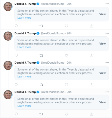 ایک اور ٹوئٹ میں ان کا کہنا تھا کہ ‘میں نے یہ انتخاب بڑے فرق سے جیتا ہے’۔ تاہم سماجی رابطے کی ویب سائٹ ٹوئٹر نے ان کی ان دونوں ٹوئٹس کے نیچے لیبل لگادیا جس پر لکھا ہے کہ حتمی نتائج کا اعلان اس وقت نہیں کیا گیا تھا جب یہ ٹوئٹ کی گئی۔ خیال رہے کہ یہ پہلی مرتبہ نہیں کہ ڈونلڈ ٹرمپ کی ٹوئٹ پر اس طرح کا لیبل لگا ہو۔ گزشتہ روز ہی ووٹنگ کا عمل کے دوران وائٹ ہاؤس میں تنہا ہوتے ہوئے ڈونلڈ ٹرمپ نے ایک غیر معمولی ٹوئٹس کیے تھے۔ ان تمام ٹوئٹس کو ٹوئٹر نے چھپاتے ہوئے اسے متنازع اور گمراہ کن کا لیبل لگادیا تھا۔ٹرمپ نے ان ٹوئٹس میں کہا تھا کہ ’عوام گنتی کے عمل کو روکنے کے لیے پکار رہے ہیں اور ہم شفافیت کا مطالبہ کرتے ہیں (کیونکہ ہمارے قانونی مبصرین کو گنتی کے کمروں میں جانے کی اجازت نہیں دی گئی تھی’۔ انہوں نے دعویٰ کیا کہ منگل کی رات 8 بجے کے بعد بھی ہزاروں ووٹ غیر قانونی طور پر موصول ہوئے جو با آسانی پینسلوانیا اور مختلف دیگر ریاستوں میں نتائج تبدیل کر رہے ہیں’۔ ان کا کہنا تھا کہ ‘یہ متعدد ریاستوں میں انتخابی نتائج کو تبدیل کردے گا، بشمول پینسلوانیا جسے سب با آسانی جیتا ہوا سمجھ رہے تھے’۔انہوں نے ایک اور ٹوئٹ میں کہا کہ ‘جن گھنٹوں میں قانونی شفافیت کی اجازت نہیں دی گئی ان میں کئی غلط چیزیں ہوئیں، ٹریکٹرز دروازوں پر رکاوٹ بنے اور کھڑکیاں موٹے کارڈ بورڈ سے ڈھک دی گئیں تاکہ مبصری گنتی کے کمروں میں دیکھ نہ سکیں’۔ انہوں نے دعویٰ کیا کہ ‘اندر غلط چیزیں ہوئیں، بڑی تبدیلیاں رونما ہوئیں’۔ واضح رہے کہ امریکا کے صدارتی انتخاب میں 4 روز تک جاری رہنے والی غیریقینی صورتحال اور اعصاب شکن مقابلے کے بعد ڈیموکریٹک اُمیدوار جو بائیڈن مطلوبہ 270 سے زائد الیکٹورل ووٹ حاصل کرنے کے بعد ملک کے 46ویں صدر منتخب ہوگئے ہیں۔ انتخاب کے دو روز بعد بھی کوئی بھی اُمیدوار مطلوبہ 270 الیکٹورل ووٹس حاصل نہیں کر سکا تھا اور ڈیموکریٹ پارٹی سے تعلق رکھنے والے جو بائیڈن 264 جبکہ ڈونلڈ ٹرمپ 214 الیکٹورل ووٹس ہی حاصل کرسکے تھے۔ انھوں نے 78 سالہ جو بائیڈن امریکا کے سب سے زائد العمر صدر ہوں گے جو جنوری 2021 میں اپنا منصب سنبھالیں گے۔