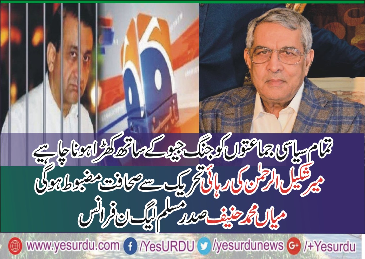 پیرس؍اسلام آباد(ایس ایم حسنین) پاکستان مسلم لیگ ن فرانس کے صدر میاں محمد حنیف نے تمام سیاسی جماعتوں پرزور دیا ہے کہ جنگ جیو گروپ کے مالک میر شکیل الرحمن کی فوری طورپر رہائی کی تحریک چلائی جانی چاہیے۔ جس شخص نے ہمیشہ جمہوری اداروں کی بہتری کیلئے کام کیا اور حکومتوں کے بہتر کاموں کی تشہیر اور خامیوں کو بے نقاب کر کے بہت بڑا قومی کردار نبھایا ہے ایسے قومی ہیرو کو سلاخوں کے پیچھے رکھنا ملک کی بدقسمتی ہے