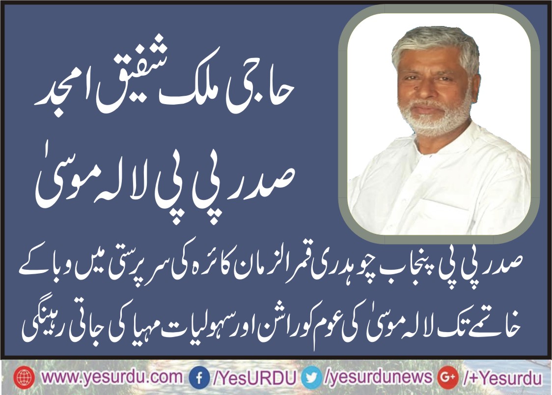 لالہ موسیٰ؍ راولپنڈی(ایس ایم حسنین) پاکستان پیپلزپارٹی لالہ موسیٰ کے صدر حاجی ملک شفیق امجد نے کہا ہے کہ پیپلز پارٹی وسطی پنجاب کے صدر قمر زمان کائرہ کی سرپرستی میں تمام کارکنان جوش وجذبہ سے کام کر رہے ہیں انشااللہ وبا کے خاتمے تک عوام کو سستا کھانا ، راشن اور سہولیات مہیا کرتے رہینگے۔ انکا کہنا تھا کہ وفاقی حکومت ضلعی انتظامیہ کو ابھی تک مالی امداد مہیا کرنے میں ناکام ہے اسے چاہیے کہ ہنگامی بنیادوں پر امداد جاری کرے تاکہ کورونا وائرس سے بہتر انداز سے نمٹا جا سکے ،
