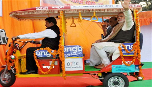 نئی دہلی……بھارتی ریاست اتر پردیش کے شہر لکھنؤ میں بھارتی وزیر اعظم نریندر مودی نے ای رکشہ کی سواری کی۔