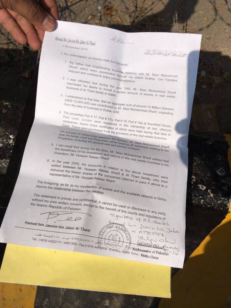 اسلام آباد ۔ سپریم کورٹ میں پاناما لیکس کیس کی سماعت کے دوران وز یراعظم نواز شریف کے بچوں کے وکیل اکرم شیخ نے جوابی دستا ویزات کے ساتھ قطر کے شہزادے حمد بن جا سم جس کی پیدائش 1984 کوہئی اس کے خط کی کاپی بھی جمع کرادی جس میں انہوں نے کہاکہ میرے والد کے شریف خاندان کے ساتھ کاروباری تعلقات تھے ۔سپریم کورٹ میں چیف جسٹس انور ظہیر جمالی کی سربراہی میں پانچ رکنی بینچ نے پاناما لیکس کیس کی سماعت کی ۔اس موقع پر مریم ،حسن اور حسین نواز کے وکیل اکرم شیخ نے جوابی دستا ویزات کے ساتھ قطر کے شہزادے حمد بن جاسم بن جبر الثانی کا خط بھی جمع کرا دیا ۔خط میں حمد بن جا سم بن جبر الثانی نے کہا کہ میر ے والد کے شریف خاندان کے ساتھ کاروباری تعلقات تھے ،میاں شریف نے قطر کے الثانی گروپ میں سرمایہ کاری میں دلچسپی ظاہر کی تھی ۔انہوں نے کہا کہ 1980میں میا ں شریف نے الثانی خاندان کے ریئل اسٹیٹ کاروبار میں سرمایہ کاری کی خواہش ظاہر کی تھی ۔حمد بن جاسم نے کہا کہ شریف خاندان کے ساتھ ذاتی تعلقات بھی ہیں ۔انہوں نے کہا کہ میا شریف کی طرف سے ایک کروڑ بیس لاکھ درہم کی سرمایہ کاری کی گئی تھی جو دبئی میں فیکٹری بیچ کر حاصل کیے گئے تھے: ۔