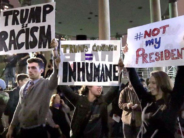واشنگٹن: نومنتخب امریکی صدر ڈونلڈٹرمپ کے خلاف مظاہروں کاسلسلہ تیسرے روزبھی جاری ہے، امریکاکے کئی شہروں میں مظاہرین نے سڑکیں بلاک کردیں اور توڑپھوڑ کی، ڈونلڈ ٹرمپ کے خلاف شدیدنعرے بازی کی گئی، اٹلانٹا میں ہزاروں افراد نے سڑکوںپر مارچ کیا، پولیس نے 200 مظاہرین کو گرفتارکرلیا۔