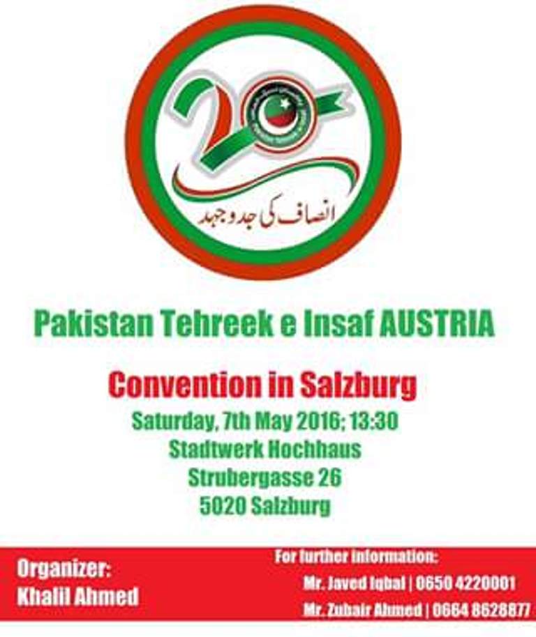ویانا (محمد اکرم باجوہ) پی ٹی آئی آسٹریا کے زیر اہتمام مورخہ 7 مئی بروز ہفتہ 2016 پی ٹی آئی آسٹریا کنونشن” سالزبرگ شہر میں منعقد کیا جا رہا ہے۔ آپ کی شرکت اور تجاویز سے ہی پارٹی کو مذید منظم اور مستحکم کیا جا سکتا ہے۔ اپنی اور ساتھیوں کی شرکت کو یقینی بنائیں اور پاکستان میں تبدیلی لانے میں اپنا اہم کردار ادا کریں۔ شکریہ