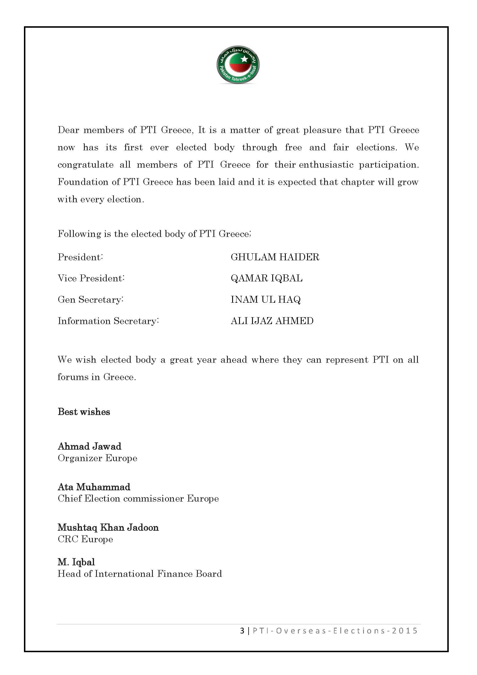 ساتھ ہی امید کی گئی ہے کہ اِس میں ہر الیکشن کیساتھ اضافہ ہوگا،نوٹیفیکیشن میں تمام منتخب عہدیداران کے نام انکے عہدوں کیساتھ درج ہیں ،جس کے تحت : صدرغلام حیدر،نائب صدر قمر اقبال ، سیکریٹری جنرل انعام الحق اورسیکریٹری انفارمیشن علی اعجاز احمدہیں۔نوٹیفیکیشن میں منتخب کابینہ سے توقع کی گئی ہے کہ وہ یونان تمام فورمزپرپاکستان تحریک انصاف کی نمائندگی کرینگے ۔ مذکورہ نوٹیفیکیشن کو جاری کرنیوالوں میں پاکستان تحریک انصاف یورپ کے آرگنائزاحمد جواد،پاکستان تحریک انصاف کے چیف الیکشن کمشنر یورپ عطا محمد،پاکستان تحریک انصاف کونفلکٹ ریزولوشن کمیٹی یورپ مشتاق خان جدون اورپاکستان تحریک انصاف ہیڈ آف انٹرنیشنل فنانس بورڈ ایم اقبال کے نام دیکھے جاسکتے ہیں۔