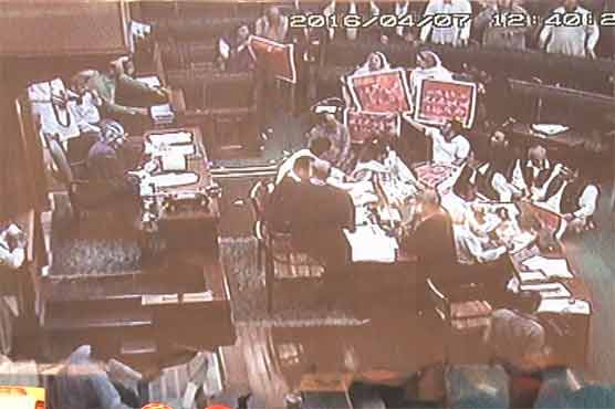پاناما لیکس کے معاملے پر پنجاب اسمبلی میں اپوزیشن نے ایوان میں ہی دھرنا دیدیا، ارکان چھپا کر پوسٹر اور پلے کارڈز ایوان میں لے گئے، حکومتی رکن نے بھی شوکت خانم کے فنڈز کی تحقیقات کے لئے قرارداد جمع کرا دی۔