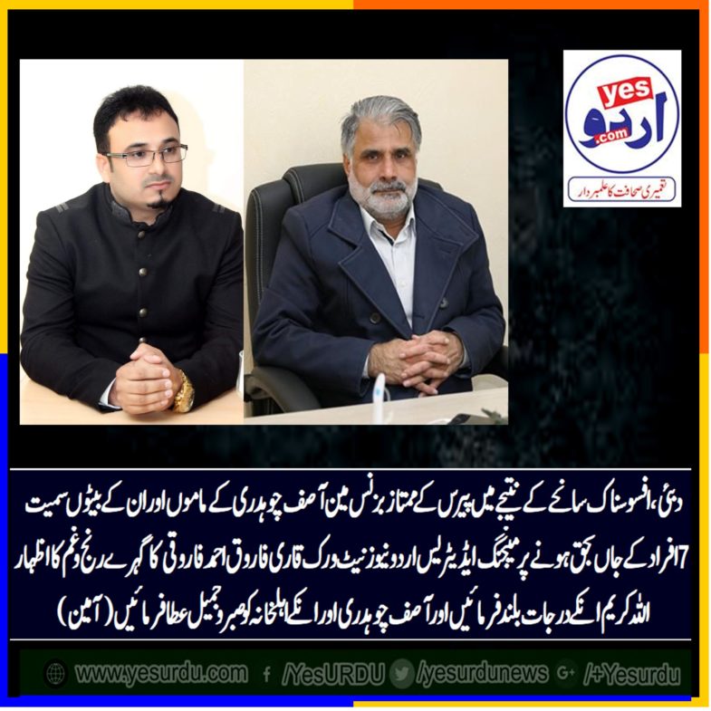 انتقال پر ملال، إنالله وإنا إليه راجعون فرانس کے ممتاز بزنس مین آصف چوہدری کے ماموں اور انکے بیٹو سمیت7 افراد دبئی میں افسوسناک حادثے کی صوررت میں جاں بحق، میجنگ ایڈیٹر یس اردو نیوز نیٹ ورک قاری فاروق احمد فاروقی کا دلی رنج وغم کا اظہار