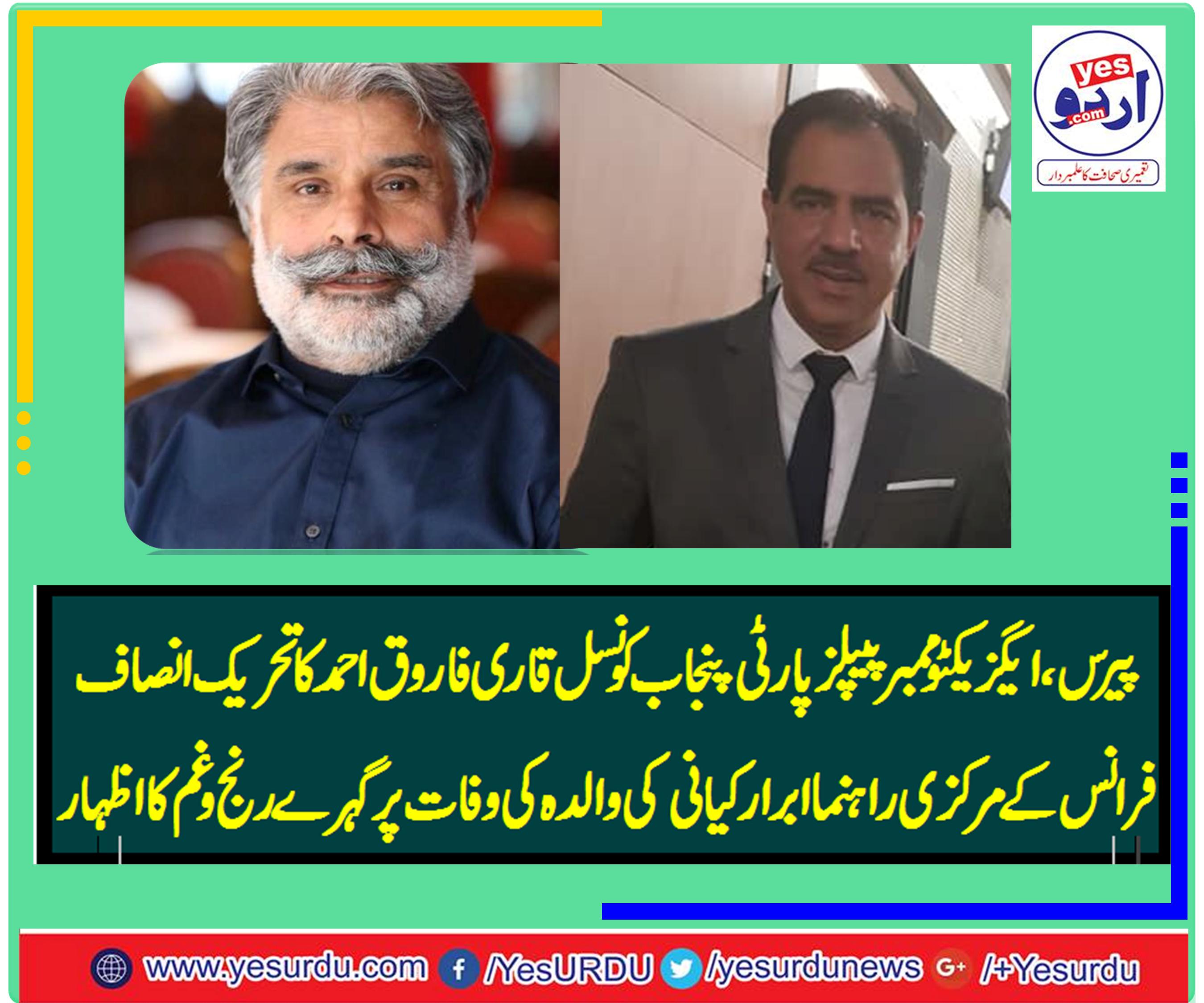 پیرس/اسلام آباد(ایس ایم حسنین) پاکستان پیپلز پارٹی پنجاب کونسل کے ممبر قاری فاروق احمد فاروقی نے تحریک انصاف فرانس کے مرکزی راہنما ابرارکیانی کی والدہ کی وفات پر گہرے رنج وغم کا اظہار کیا اور دعائے مغفرت کی۔