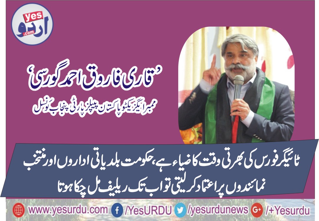ٹائیگرفورس بھرتیاں وقت اوروسائل کو ضیا ہے، حکومت بلدیاتی اداروں اورمنتخب نمائندوں کو اعتماد دے کر جلد ازجلد ریلیف کوعملی شکل دے تاکہ عوام کی مشکلات حل ہوں، قاری فاروق احمد گورسی