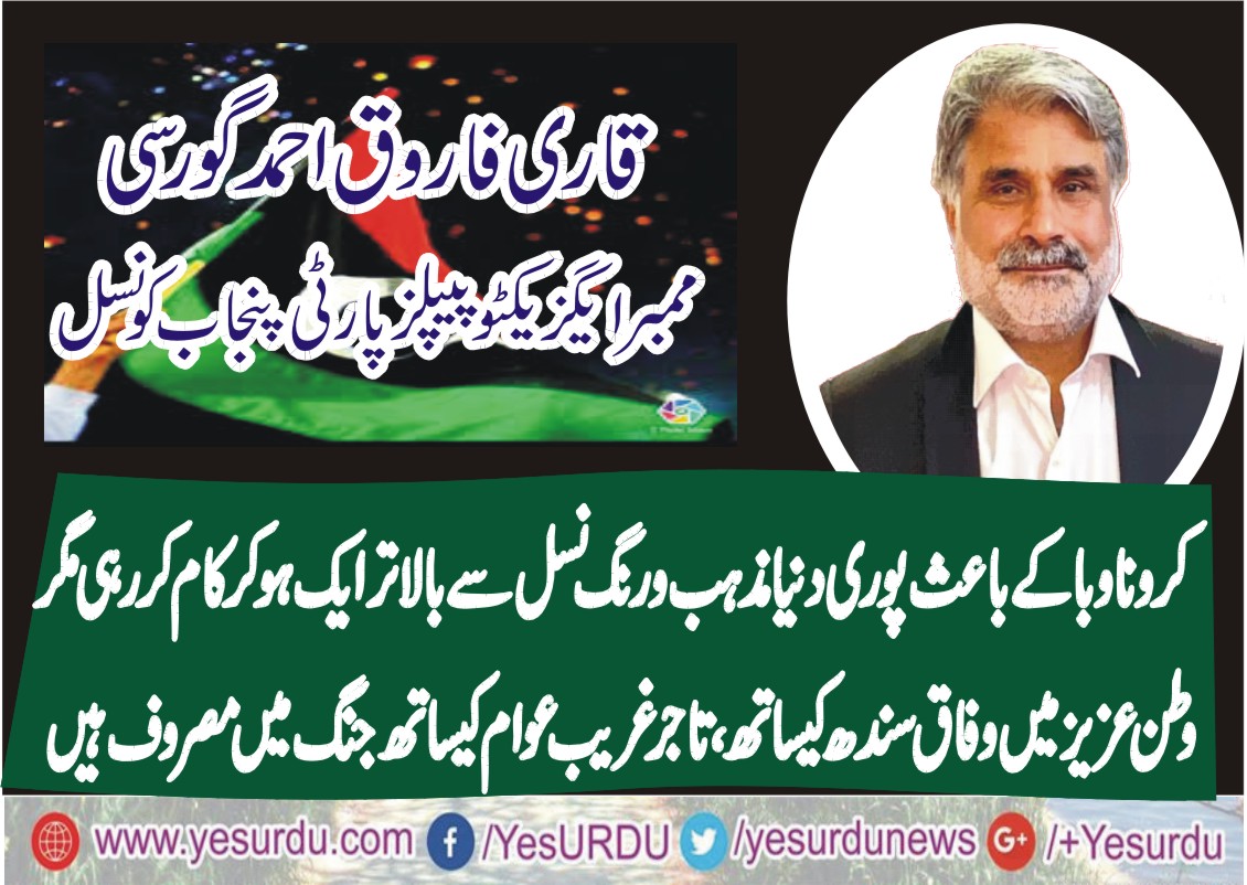 پیرس؍اسلام آباد(ایس ایم حسنین) پاکستان پیپلز پارٹی پنجاب کونسل کے ممبرایگزیکٹو قاری فاروق احمد گورسی نے کہا ہے کہ پوری دنیا میں لوگ کرونا وبا کے زیر اثر رنگ ونسل سے ماورا ایک ہوکر وبا کیخلاف ایک دوسرے کی مدد میں مصروف ہیں۔ اقوام متحدہ اربوں ڈالر جمع کر کے بلاتفریق غریب ممالک کو تقسیم کر رہی ہے جبکہ پاکستان میں وفاقی حکومت تمام وسائل پر بیٹھی ہوئی ہے اورمانگنے پر سندھ کو آنکھیں دکھائی جاتی ہیں جوکہ انتہائی کربناک صورتحال ہے۔