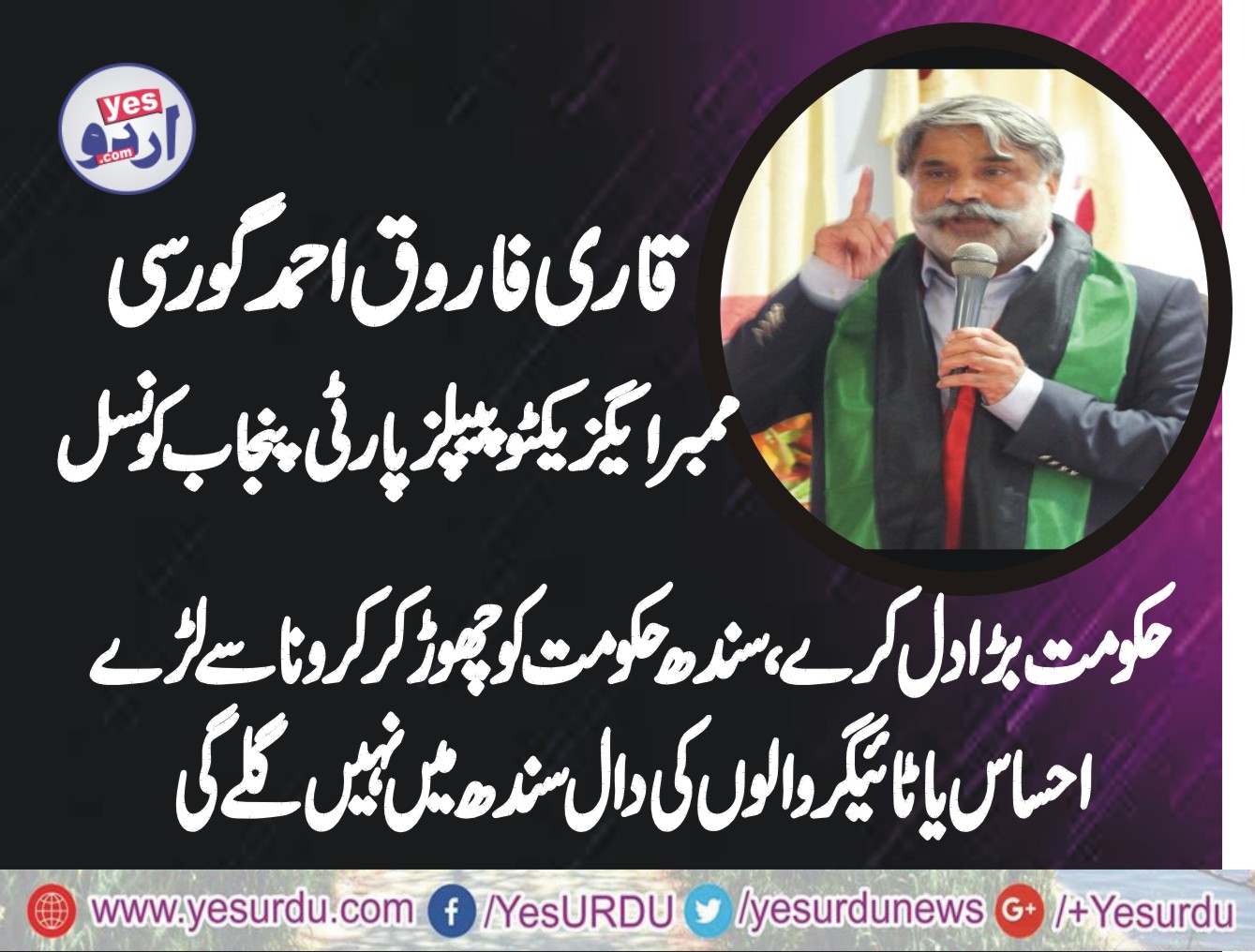 پیرس؍اسلام آباد(ایس ایم حسنین) پاکستان پیپلز پارٹی پنجاب کونسل کے ممبرایگزیکٹو قاری فاروق احمد گورسی نے حکومت کے لائحہ عمل پر شدید تنقید کرتے ہوئے کہا ہے کہ عالمی ادارے سندھ حکومت کی کرونا کیخلاف کارکردگی کا اعتراف کر رہے ہیں مگر حکومت سرپرستی کے بجائے سندھ کے ساتھ لڑائی میں مصروف ہے جو کہ انتہائی تکلیف دہ بات ہے۔
