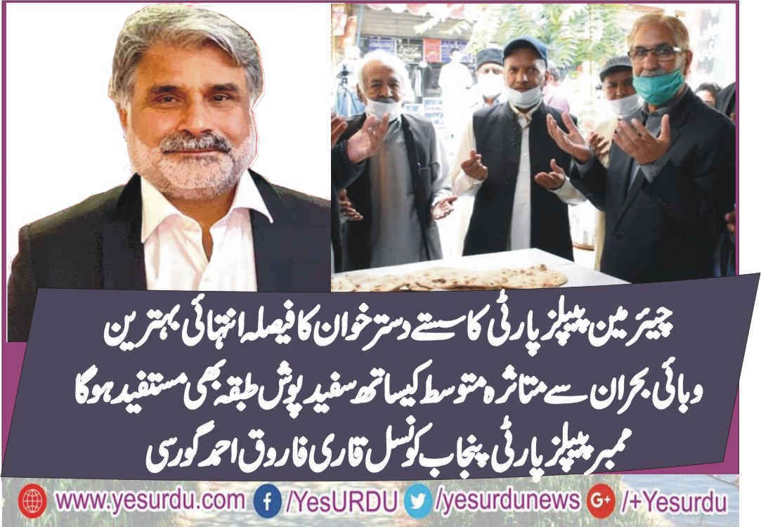 پیرس؍اسلام آباد(ایس ایم حسنین) پاکستان پیپلز پارٹی پنجاب کونسل کے ایگزیکٹو ممبر قاری فاروق احمد گورسی نے پیپلز پارٹی کی طرف سے سستے دسترخوان کھولنے کےآغاز کو سراہتے ہوئے کہا ہے کہ کورونا وبا سے متاثرہ بالخصوص سفید پوش طبقہ اور دہاڑی داروں کیلئے پیپلز پارٹی کی طرف سے سستا کھانا فراہم کرنے کیلئے ملک کے طول وعرض میں دسترخوان قائم کرنے کا آغاز کردیا گیا ہے ،عوام روٹی اور نان اب صرف پانچ روپے میں اور کھانا پچاس میں لے سکیں گے، قاری فاروق احمد گورسی نے کہا کہ کورونا کے خلاف جس طرح وسائل کی کمی کے باوجود لڑ رہی ہے وہ عوامی طریقہ ہے ۔ پاکستان پیپلز پارٹی کی قیادت کا خاصہ ہے کہ مشکل وقت میں محروم طبقات کو تنہا نہیں چھوڑتی۔ یہ وقت صرف اور صرف انسانیت کئ خدمت کا ہے شہریوں کو بچانا پاکستان بچانا ہے ، انھوں نے کہا ہے کہ قوم کے بچوں اور نادار اور حقدار خاندانوں کی خدمت بلاول بھٹو زرداری کا قابل قدر کارنامہ ہے انشااللہ وہ اپنے مقصد میں سرخرو رہیں گے۔