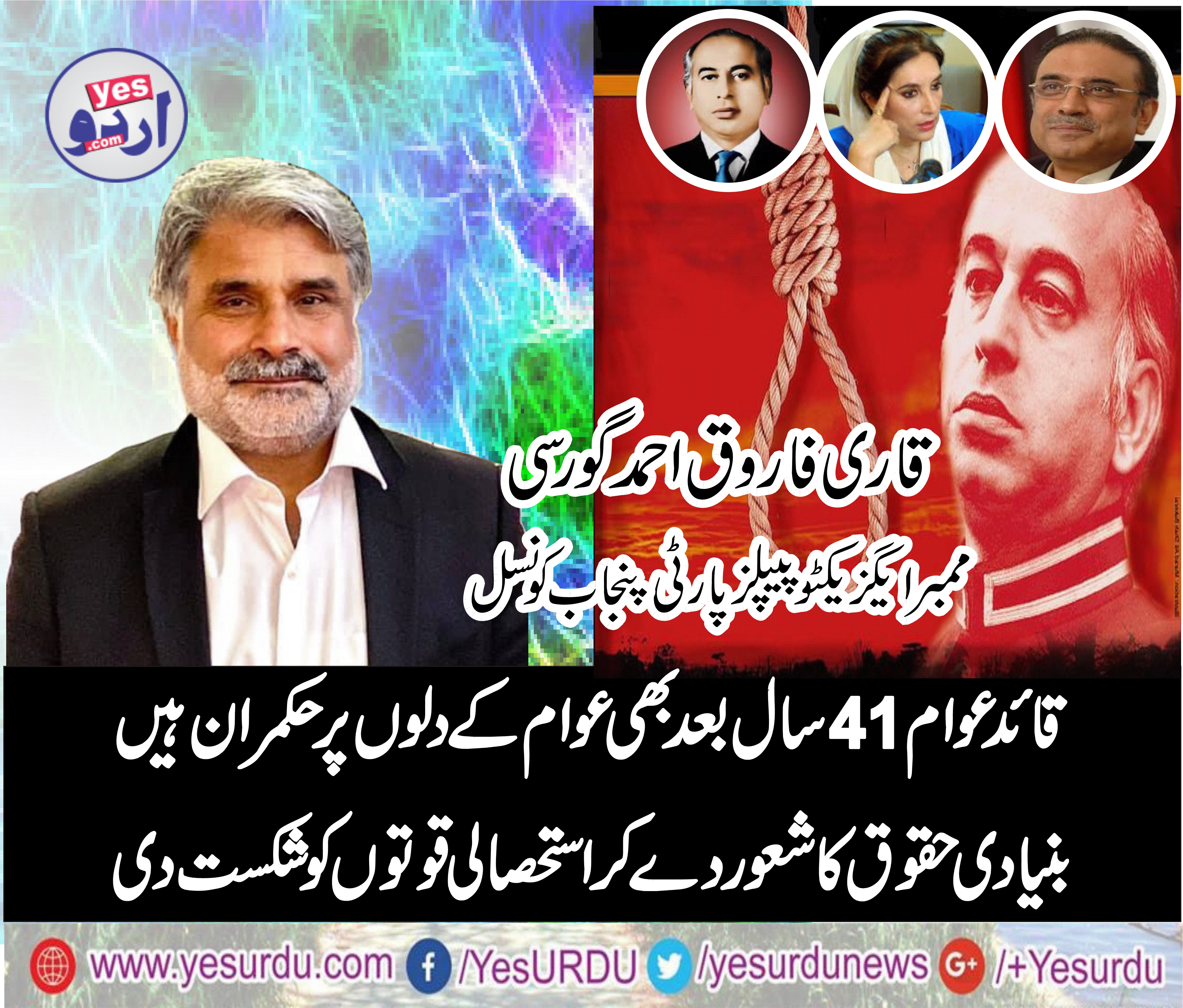 شہید بھٹو کی 41ویں برسی یادگار رہیگی، پہلے شہید بھٹو کی برسی مخصوص جگہوں پرمنائی جاتی تھی آج گھرگھر میں منائی گئی ہے، قاری فاروق احمد گورسی ممبر پیپلز پارٹی پنجاب کونسل کا ذوالفقار علی بھٹو شہید کی برسی پرپیغام