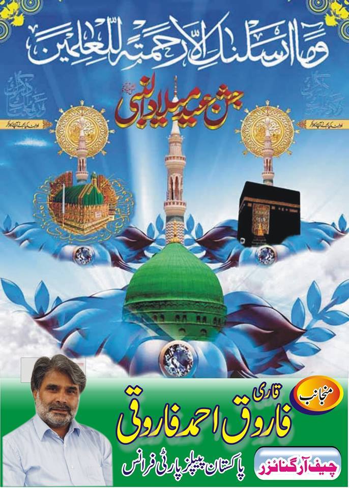 چیف آرگنائزر پاکستان پیپلزفرانس قاری فاروق احمد فاروقی کاجشن عید میلاد النبی کا اشتہار۔
