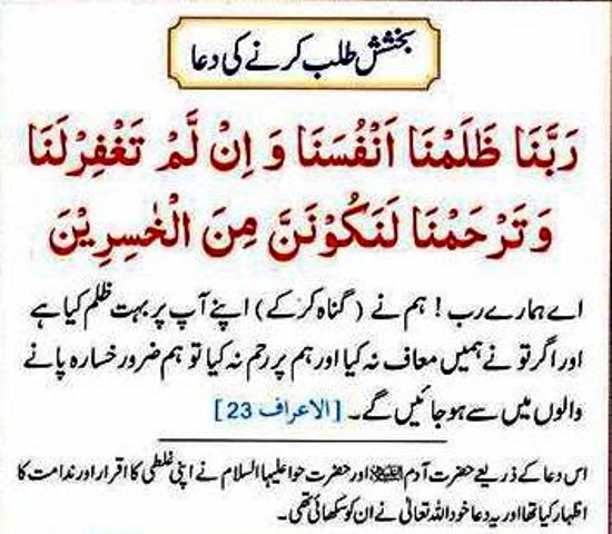 حضرت آدم ؑ کی دعا پہلی دعا شمار کی جاتی ہے جو جنت کے ممنوعہ پھل کھانے کے بعد اللہ کی ناراضگی کے بعد انہیں سکھائی گئی ٬ جسے اللہ پاک نے قبول کیا اور انہیں معاف کر دیا٬۔