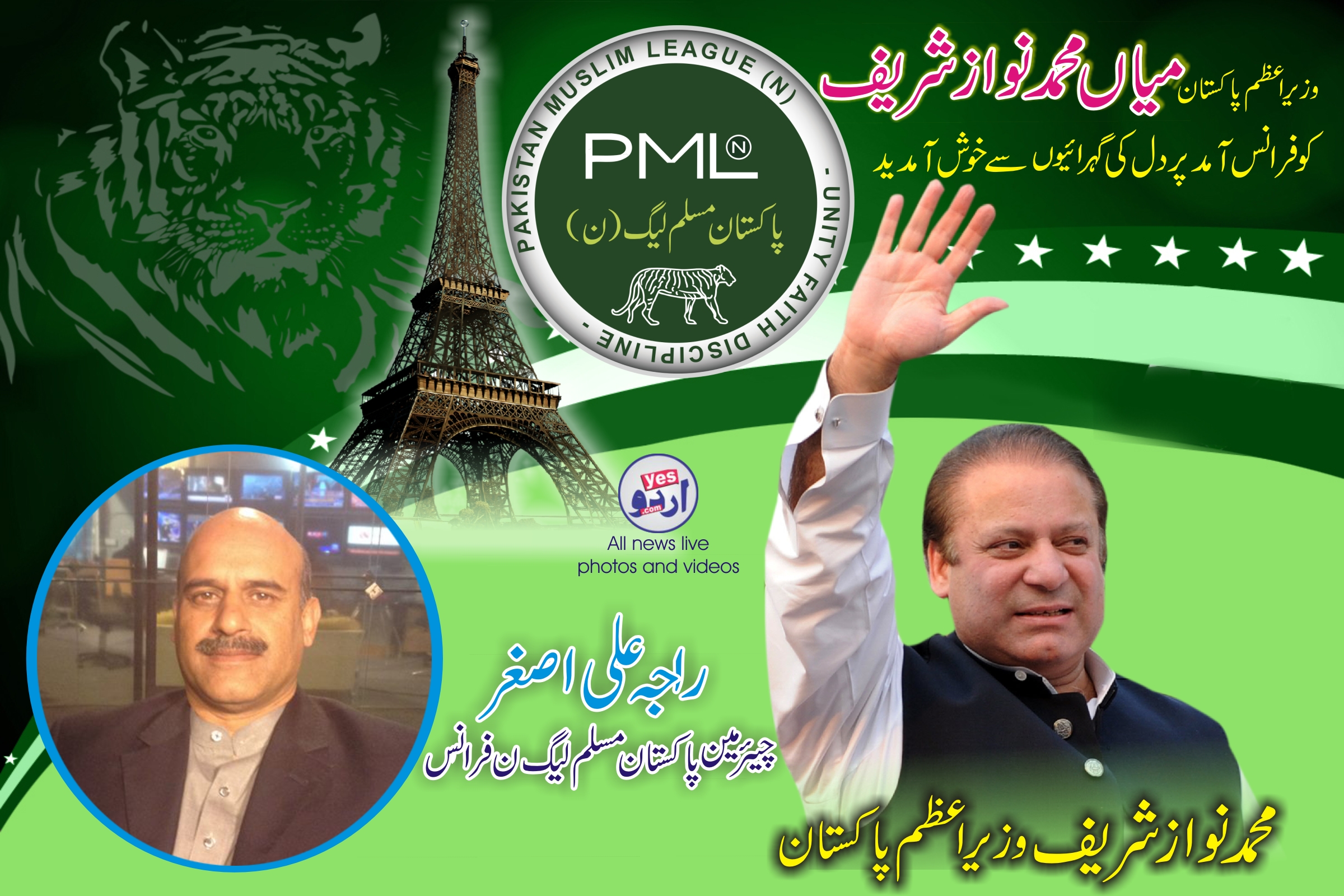 پاکستان مسلم لیگ ن فرانس کے چیئرمین راجہ علی اصغر کی طرف سے وزیراعظم پاکستان میاں محمد نواز شریف کو فرانس خوش آمدید کا اشتہار۔
