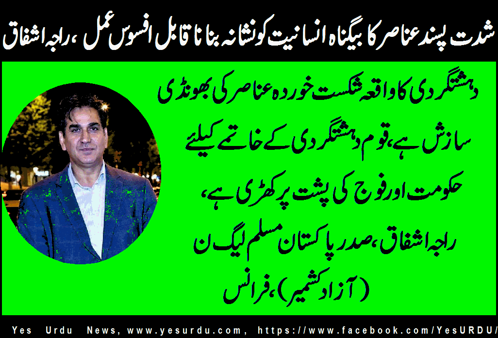 پیرس( یس اردو نیوز)پاکستان مسلم لیگ ن ّ(آزاد کشمیر)فرانس کے صدر جناب راجہ اشفاق نے بلوچستان میں مزار پر حملے کی مذمت کی اور پانے دلی دکھ کا اظہار کرتے ہوئے کہا ہے کہ دہشتگردی کا واقعہ شکست خوردہ عناصر کی بھونڈی سازش ہے ، قوم دہشتگردی کے خاتمے کیلئے حکومت اور فوج کے شانہ بشانہ کھڑی ہے ۔ انہوں نے کہا کہ بےگناہ انسانیت کو نشانہ بنانا قابل افسوس عمل ہے