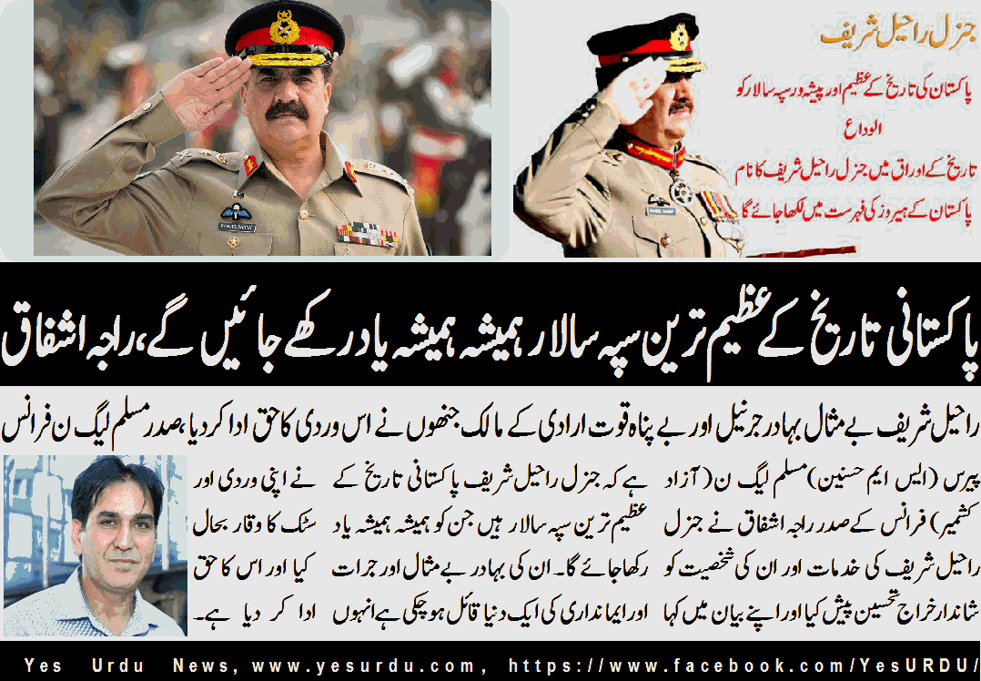 راحیل شریف بے مثال بہادرجرنیل اور بے پناہ قوت ارادی کے مالک جنھوں نے اس وردی کا حق ادا کردیا،صدر مسلم لیگ ن فرانس