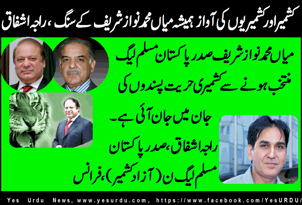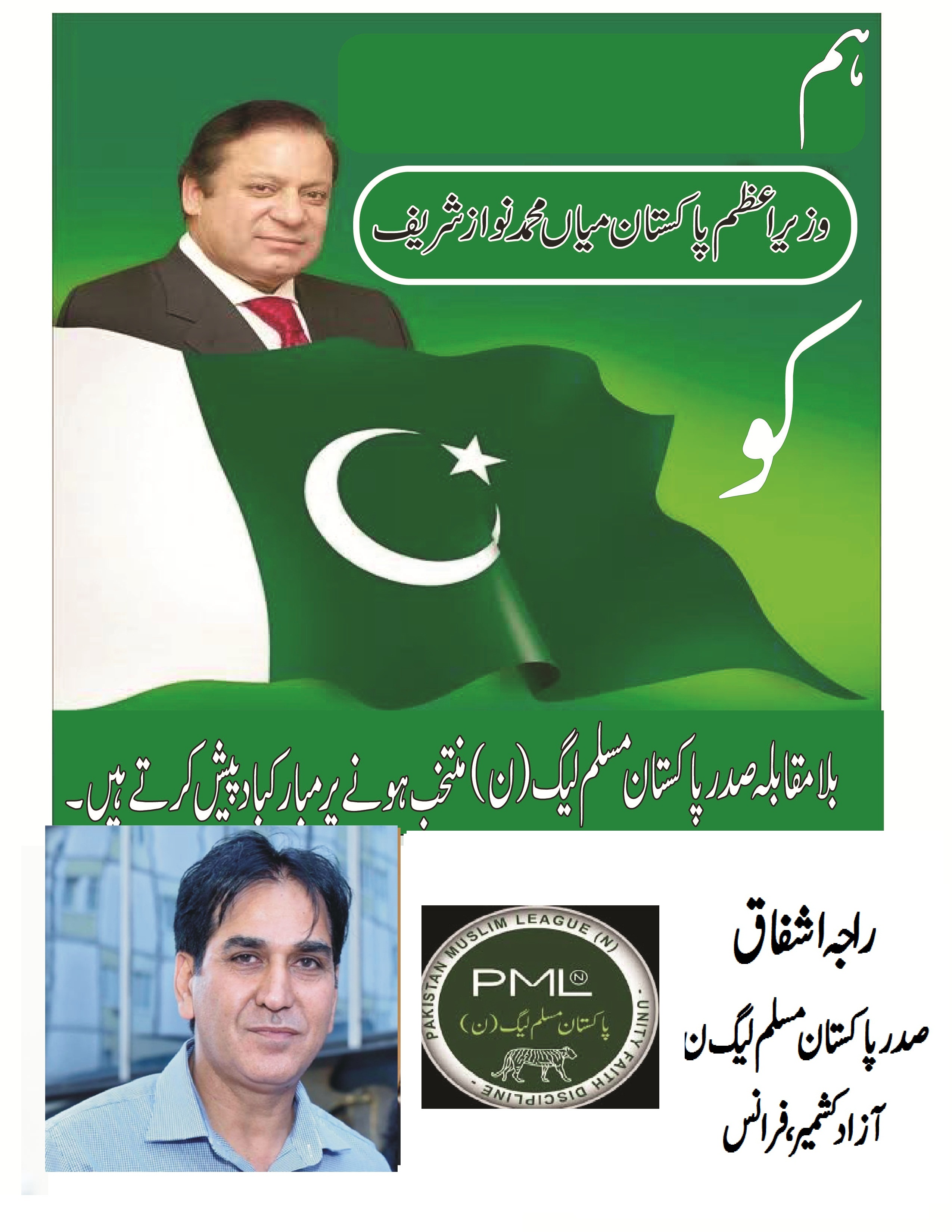 پیرس(ایس ایم حسنین) صدر پاکستان مسلم لیگ ن (آزاد کشمیر)فرانس نے اپنے بیان میں کہا ہے کہ مقبوضہ کشمیر اور آزاد کشمیر میں بسنے والے آزادی کے متوالوں کو وزیر اعظم نواز شریف کے بطور صدر پاکستان مسلم لیگ ن منتخب ہونے پر دلی خوشی ہوئی ہے اور ان کی جان میں جان آئی ہے