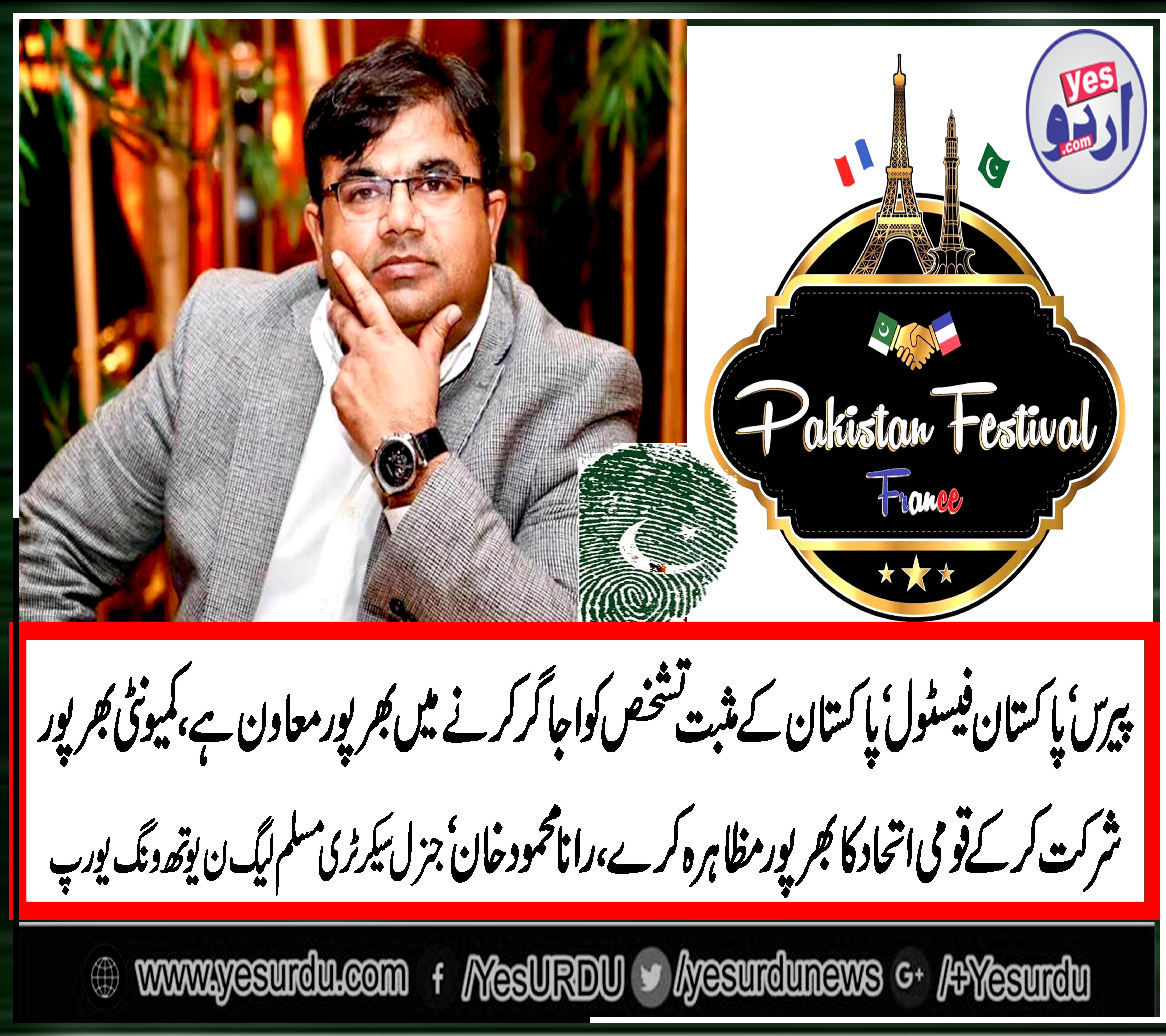 پیرس، پاکستان فیسٹول پاکستان کے مثبت تشخص کو اجاگرکرنے میں بھرپور معاون ہے، کمیونٹی بھرپور شرکت کر کے قومی اتحاد کا بھرپور مظاہرہ کرے، رانا محمود خان
