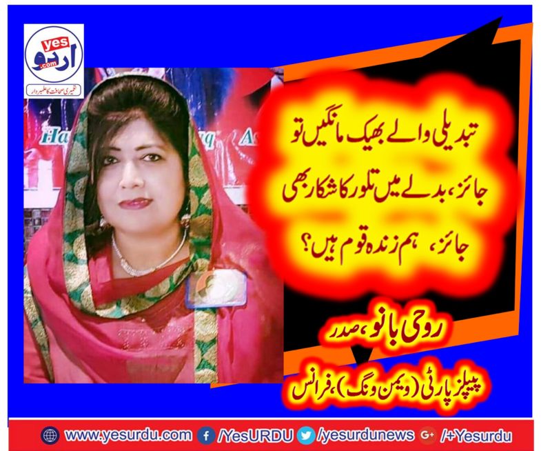 پیرس (نمائندہ خصوصی) پاکستان پیپلز پارٹی فرانس ویمن ونگ کی صدر محترمہ روحی بانو نے حکومت کے بدلتے ہوئے قومی بیانیہ کو شدید تنقید کا نشانہ بناتے ہوئے کہا ہے کہ تبدیلی والے اگر بھیک مانگیں تو وہ جائز کیسے ہوجاتی ہے اور اب تو عرب شہزادوں کو پاکستان کے دورے کی دعوت بھی دے دی گئی اب ہمارے معصوم پرندوں کے شکار پر ان کی قومی غیرت نہیں جاگے گی یا وہ بھی جائز قرار دے دیا جائیگا۔ اگر برادر ملکوں کیساتھ پیپلز پارٹی یا دوسری جماعتیں رابطہ کریں تو وہ عزت وغیرت کا مسئلہ بن جاتا ہے ۔